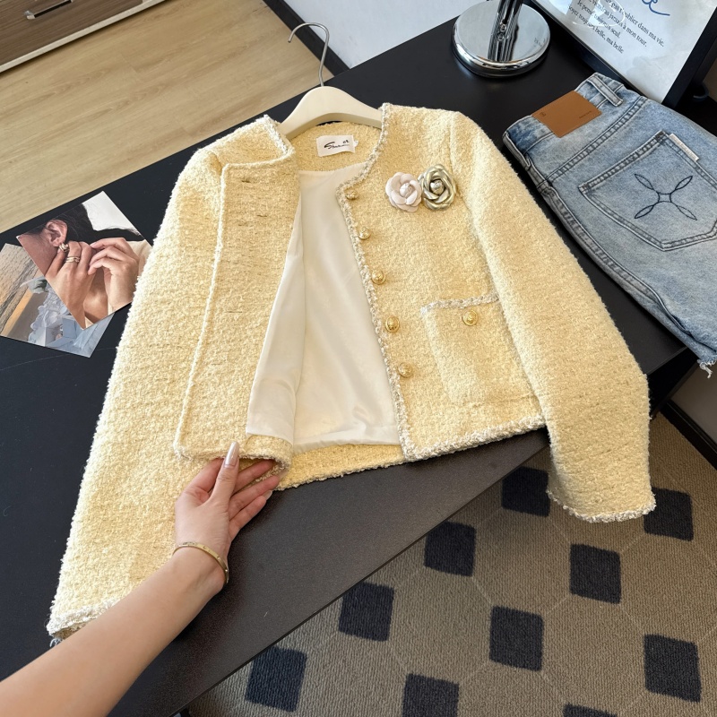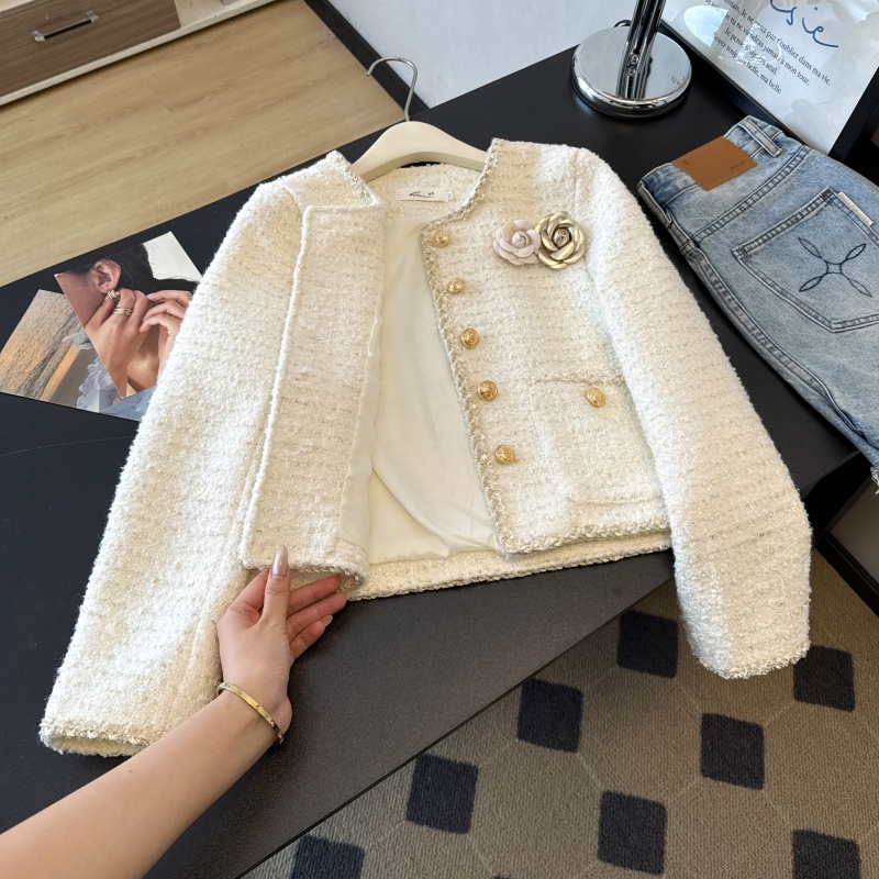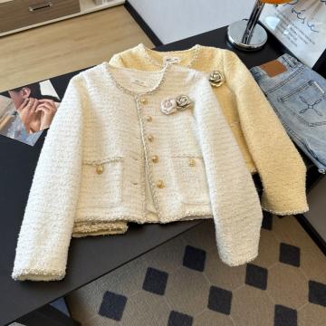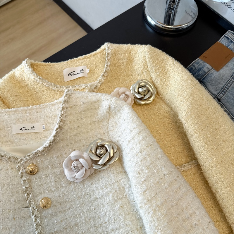 FA52642# 法式重工温柔风圆领双口袋粗花呢编织小香风外媛羽绒服外套 服裝批發女裝批發服飾貨源