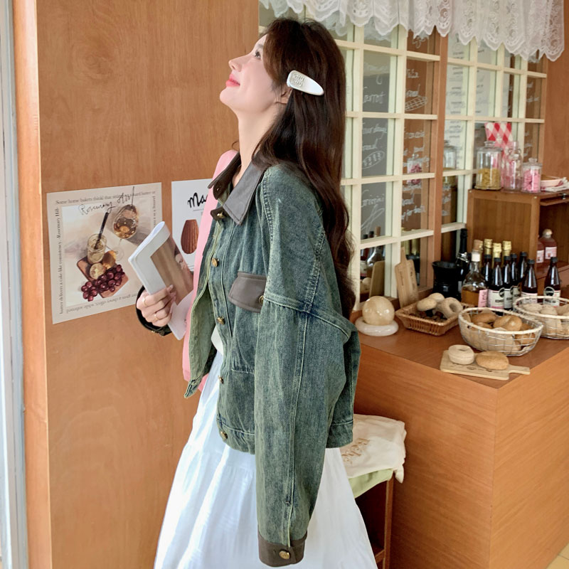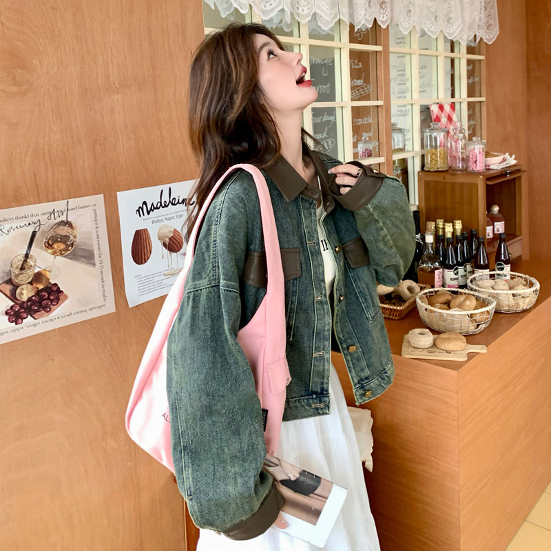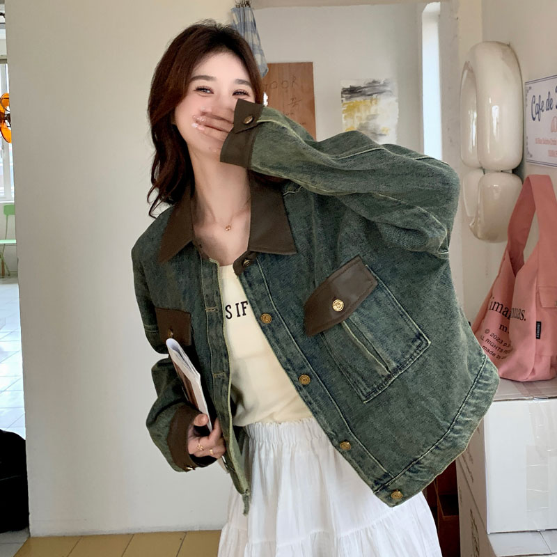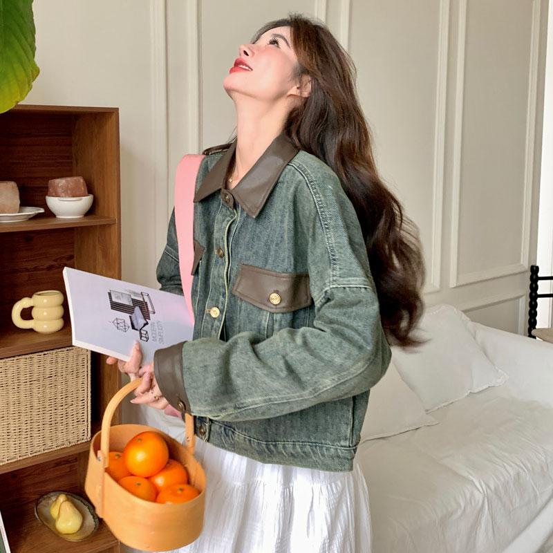 FA52668# 独特牛仔拼皮短外套女春秋新款通勤百搭可盐可甜短款上衣 服裝批發女裝批發服飾貨源