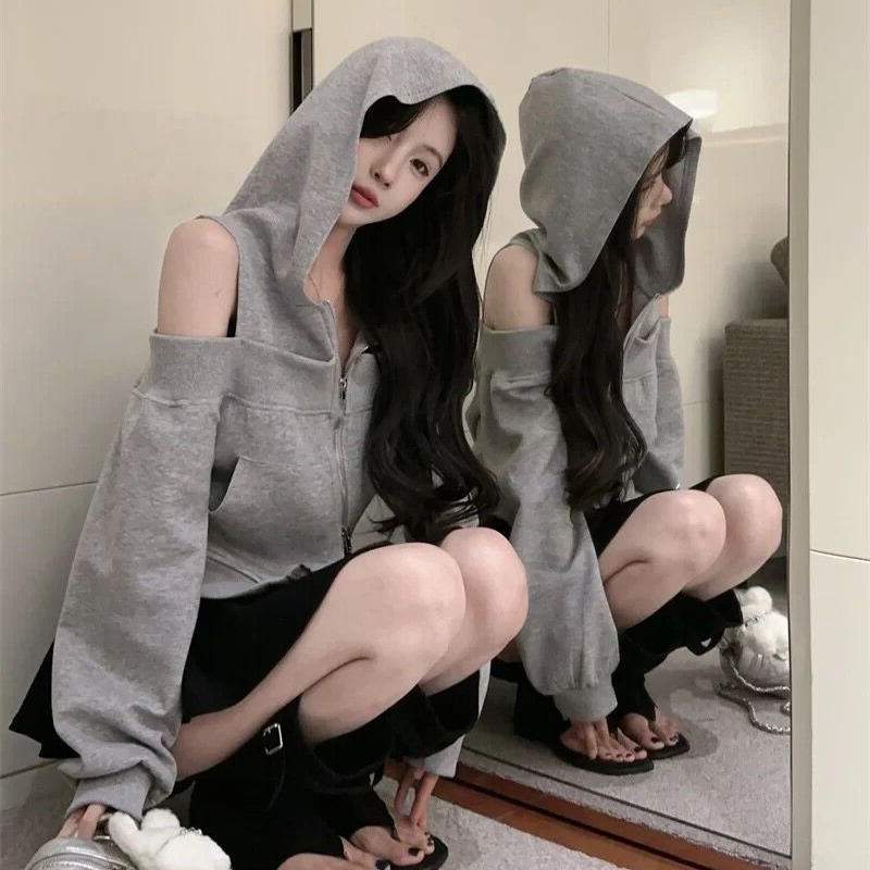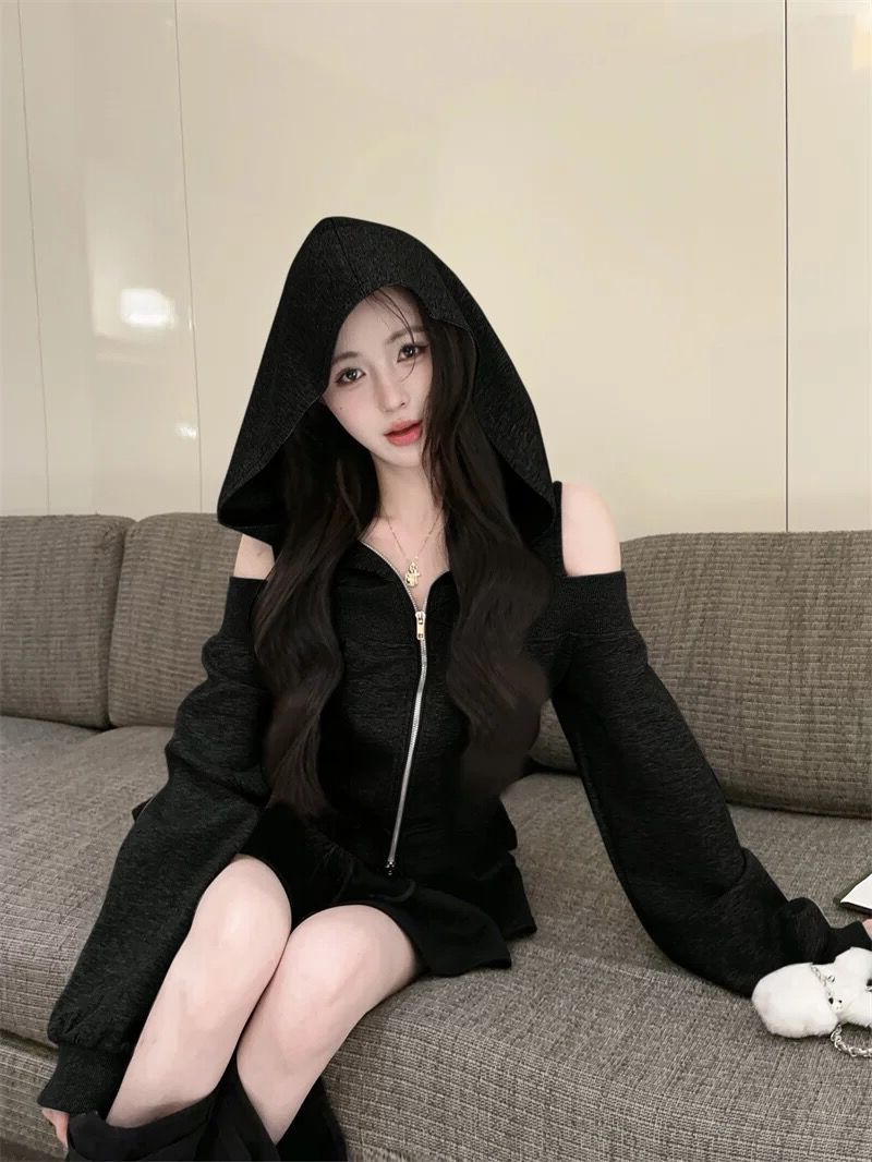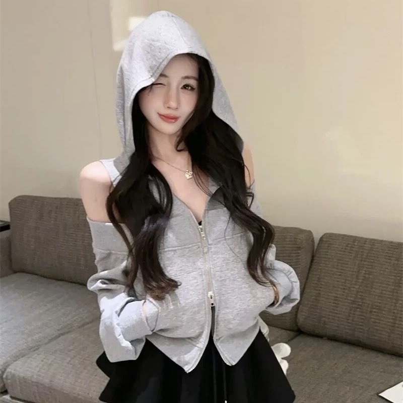 FA52669# 连帽拉链卫衣外套女秋季美式辣妹露肩上衣 服裝批發女裝批發服飾貨源