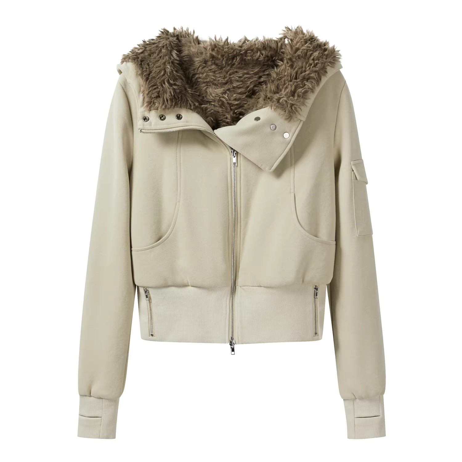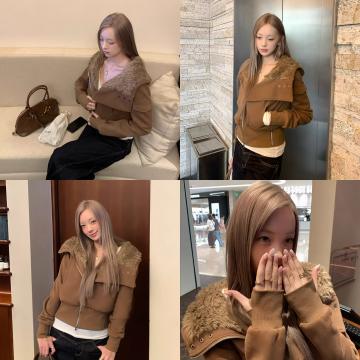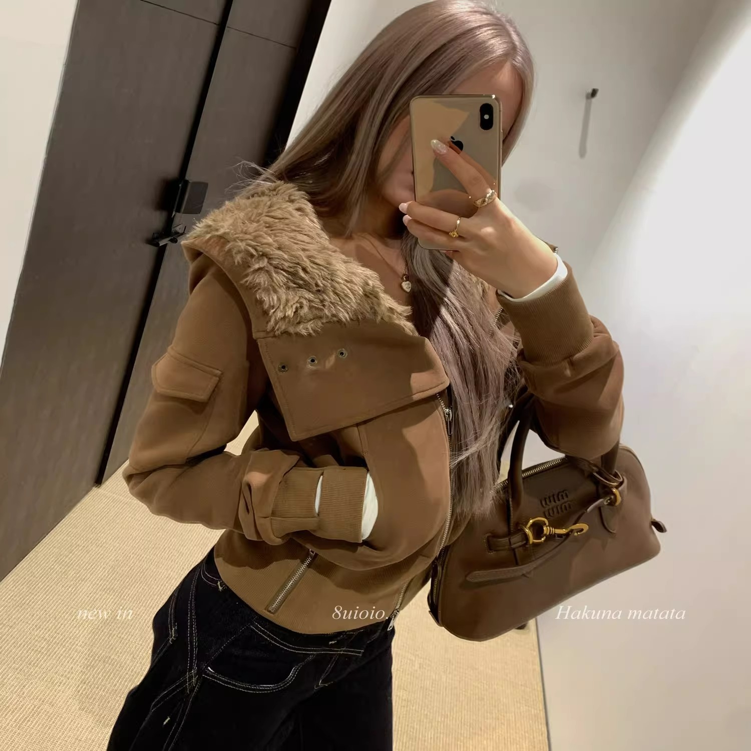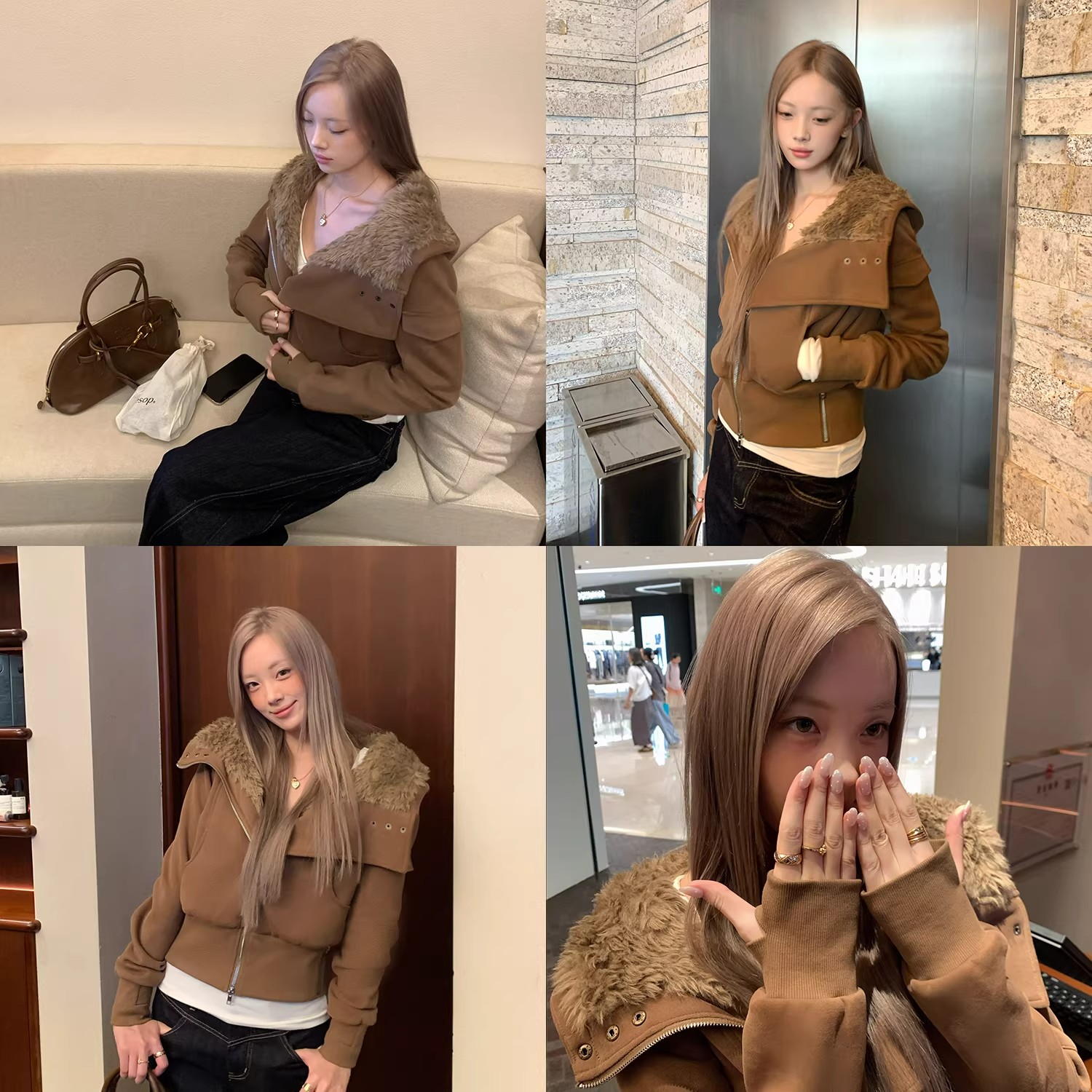 FA52670# 复古焦糖色毛领外套女冬季新款美式设计感修身保暖短款上衣 服裝批發女裝批發服飾貨源
