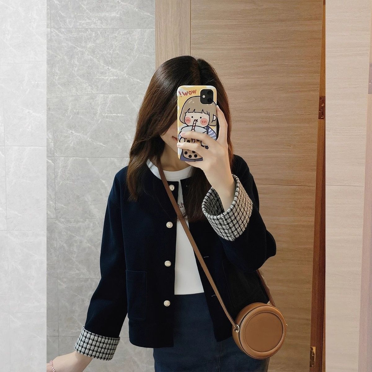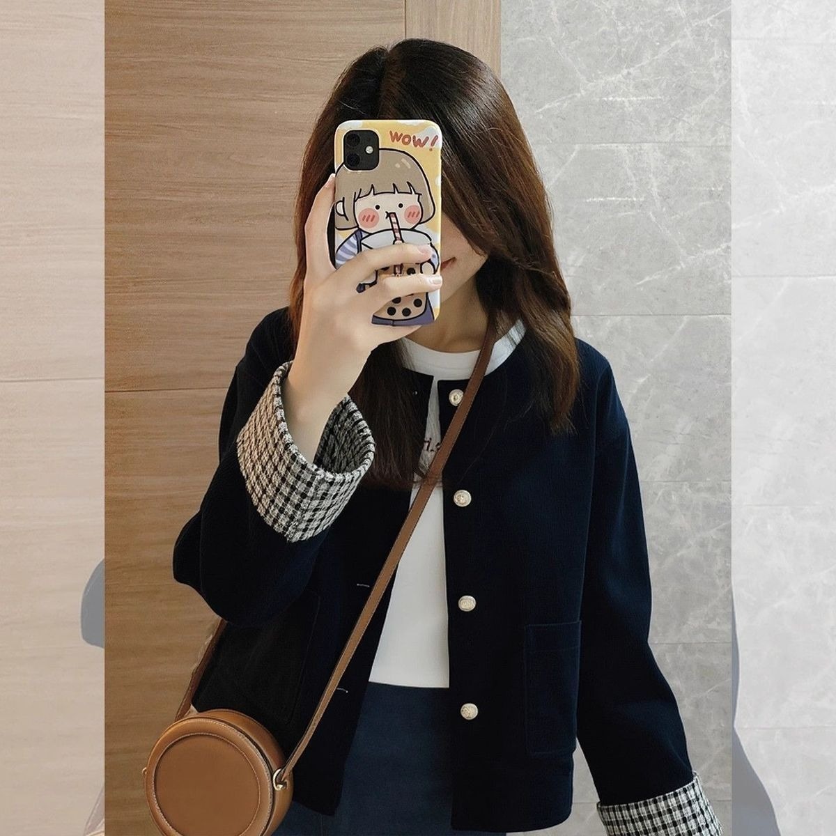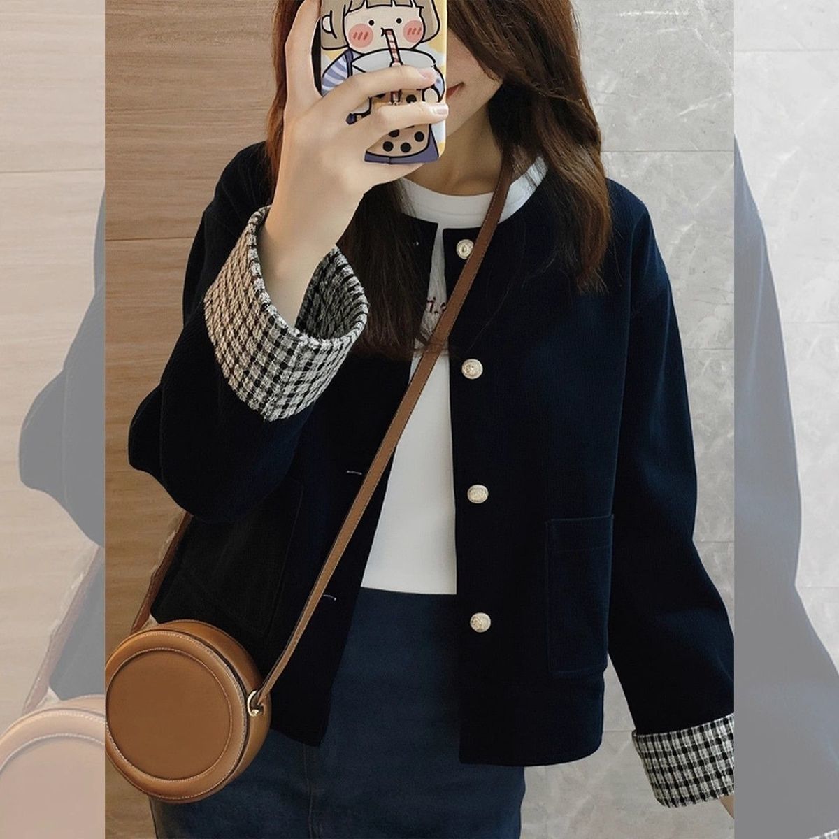 FA52671# 春秋季新款高级气质复古格子拼接夹克灯芯绒藏蓝色外套秋冬 服裝批發女裝批發服飾貨源