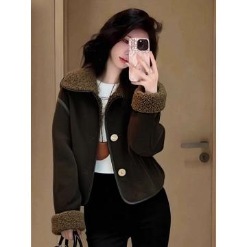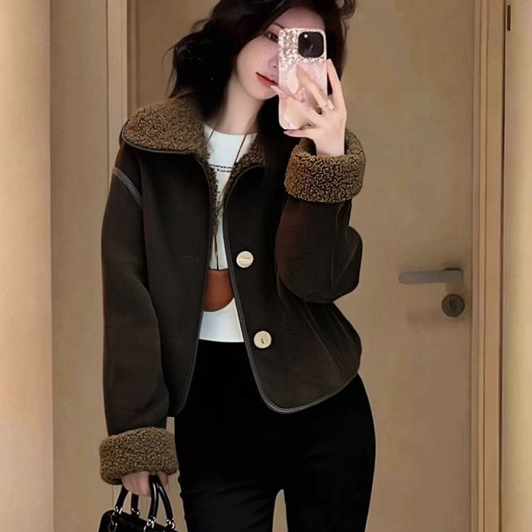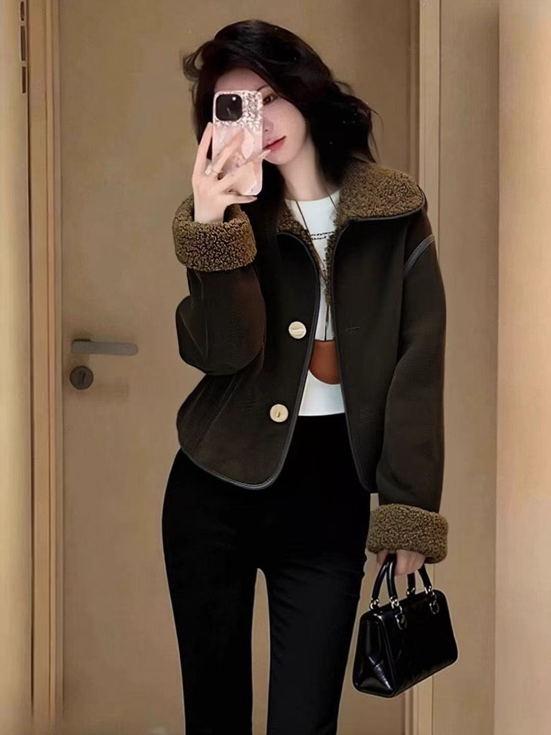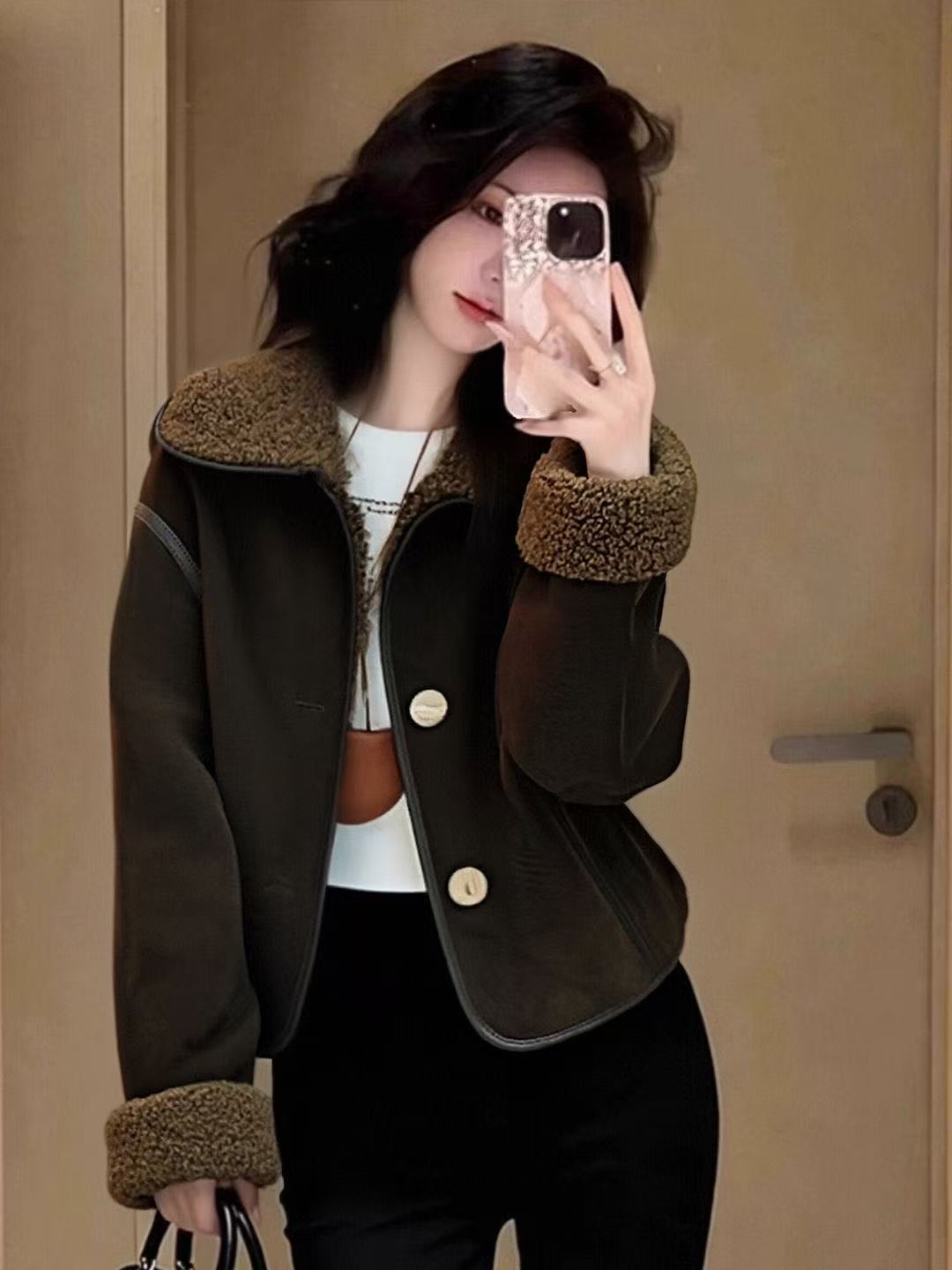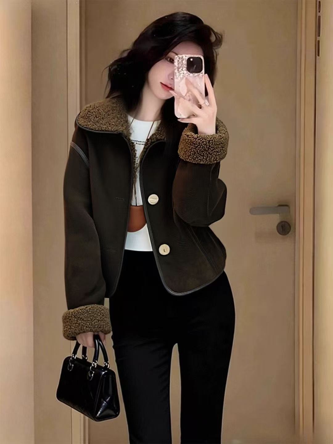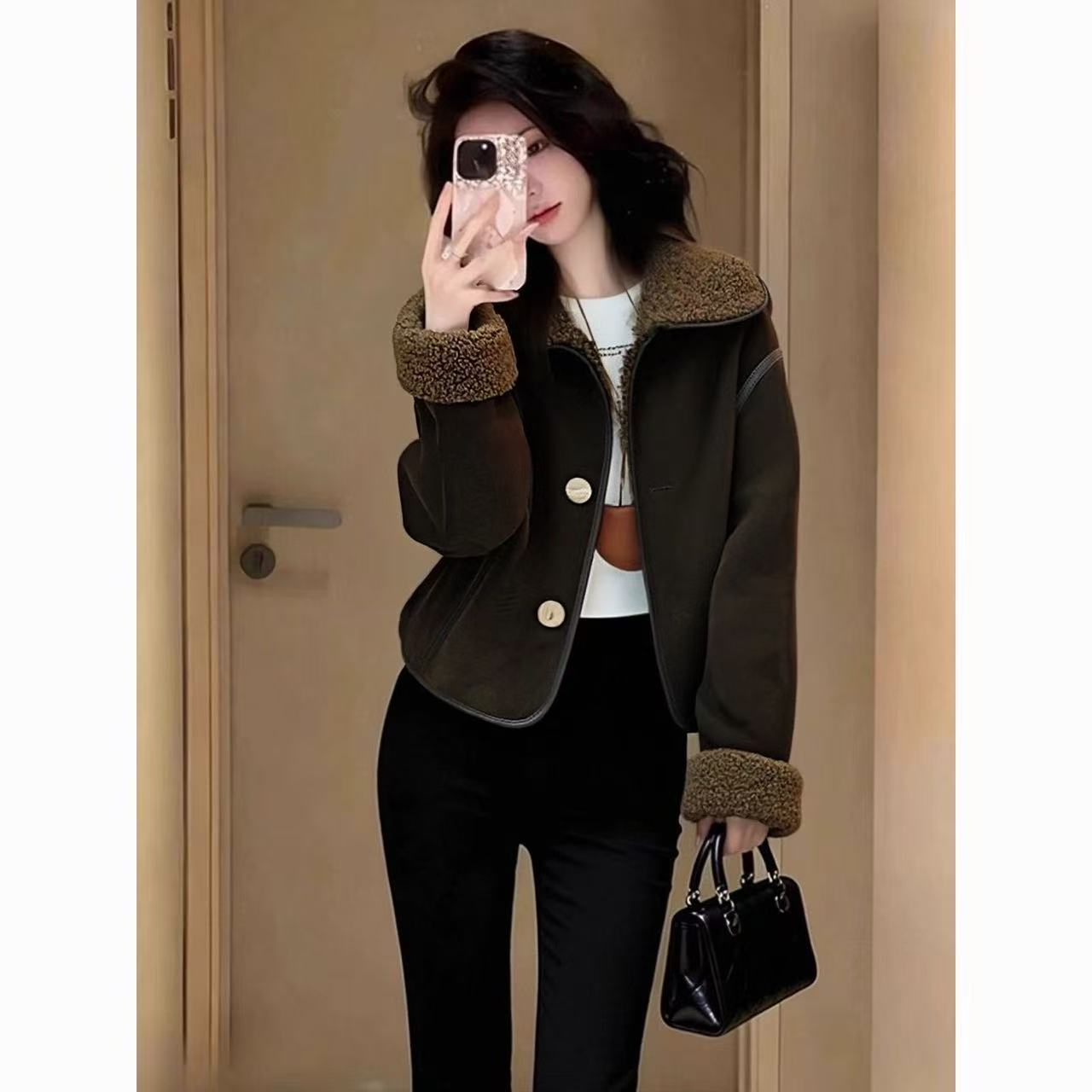 FA52672# 新款上新女装咖色翻领皮毛一体加绒加厚短款羊羔毛外套女冬季 服裝批發女裝批發服飾貨源