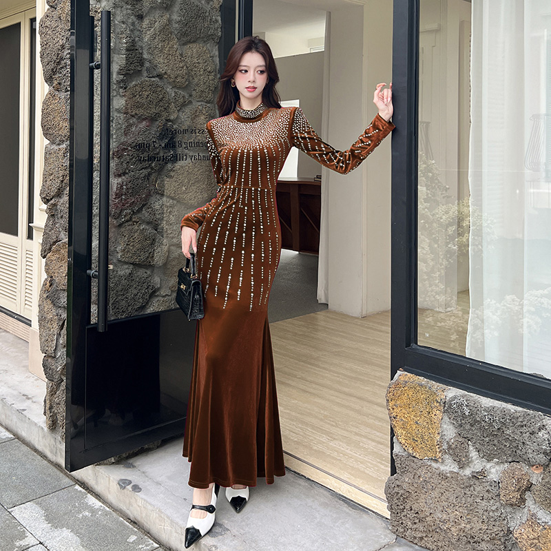 FA52675# 视频秋冬金丝绒烫钻长裙包臀连衣裙 服裝批發女裝批發服飾貨源