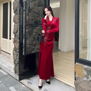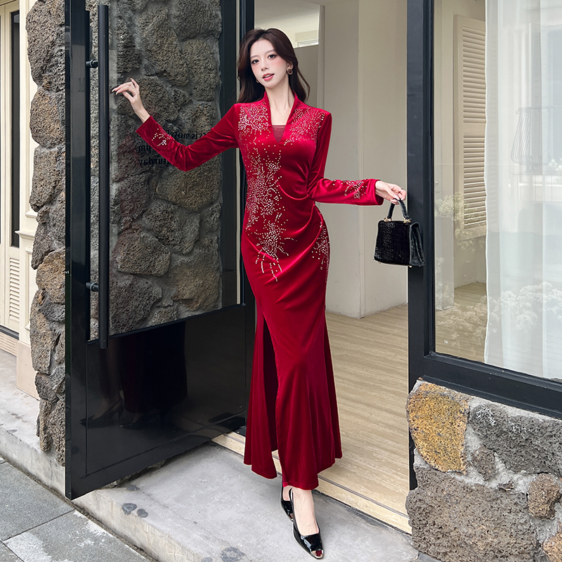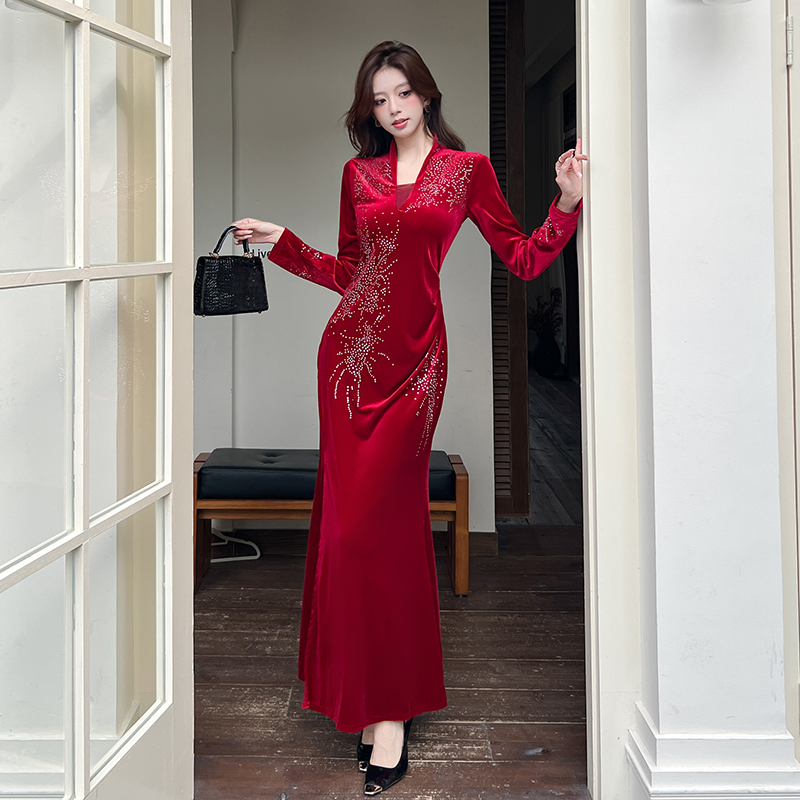FA52676# 视频秋季时尚v领烫钻长裙包臀连衣裙 服裝批發女裝批發服飾貨源
