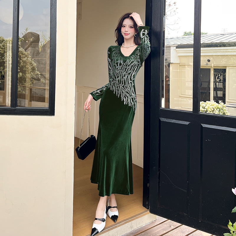 FA52677# 视频秋季时尚气质金丝绒不对称长裙包臀连衣裙 服裝批發女裝批發服飾貨源