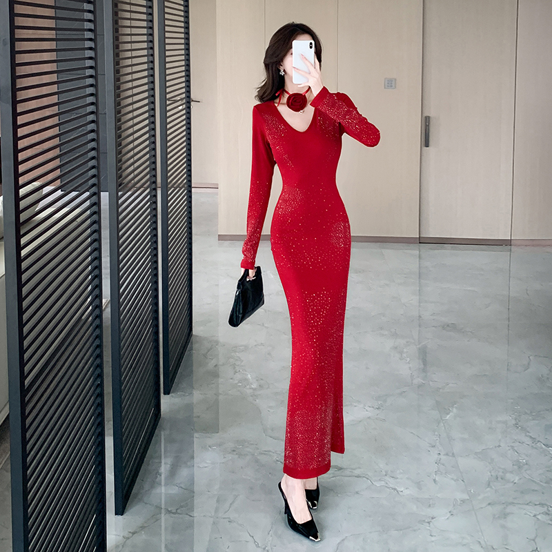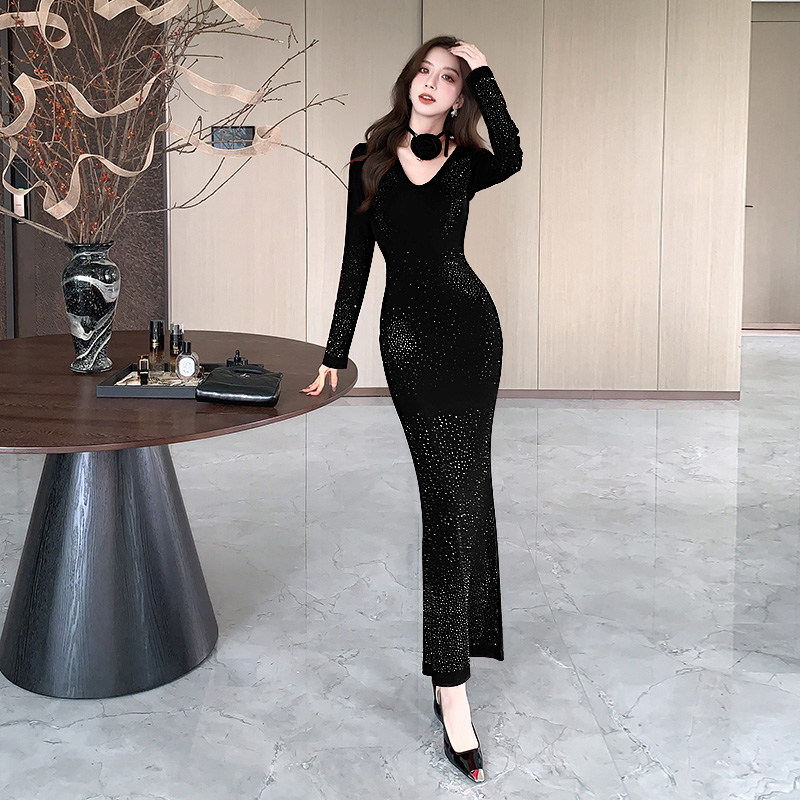 FA52681# 视频春季新款时髦洋气v领亮丝紧身长裙包臀连衣裙 服裝批發女裝批發服飾貨源