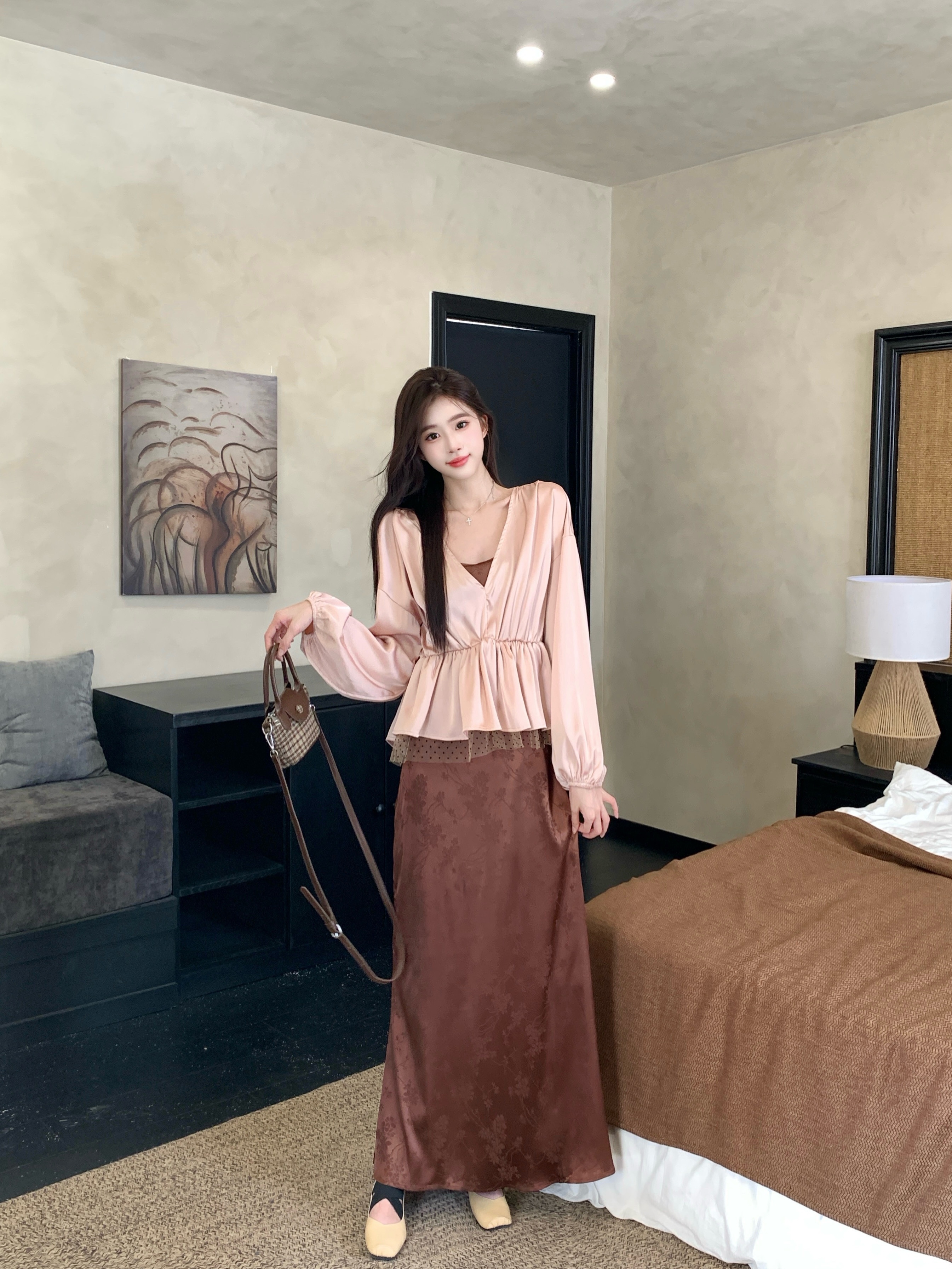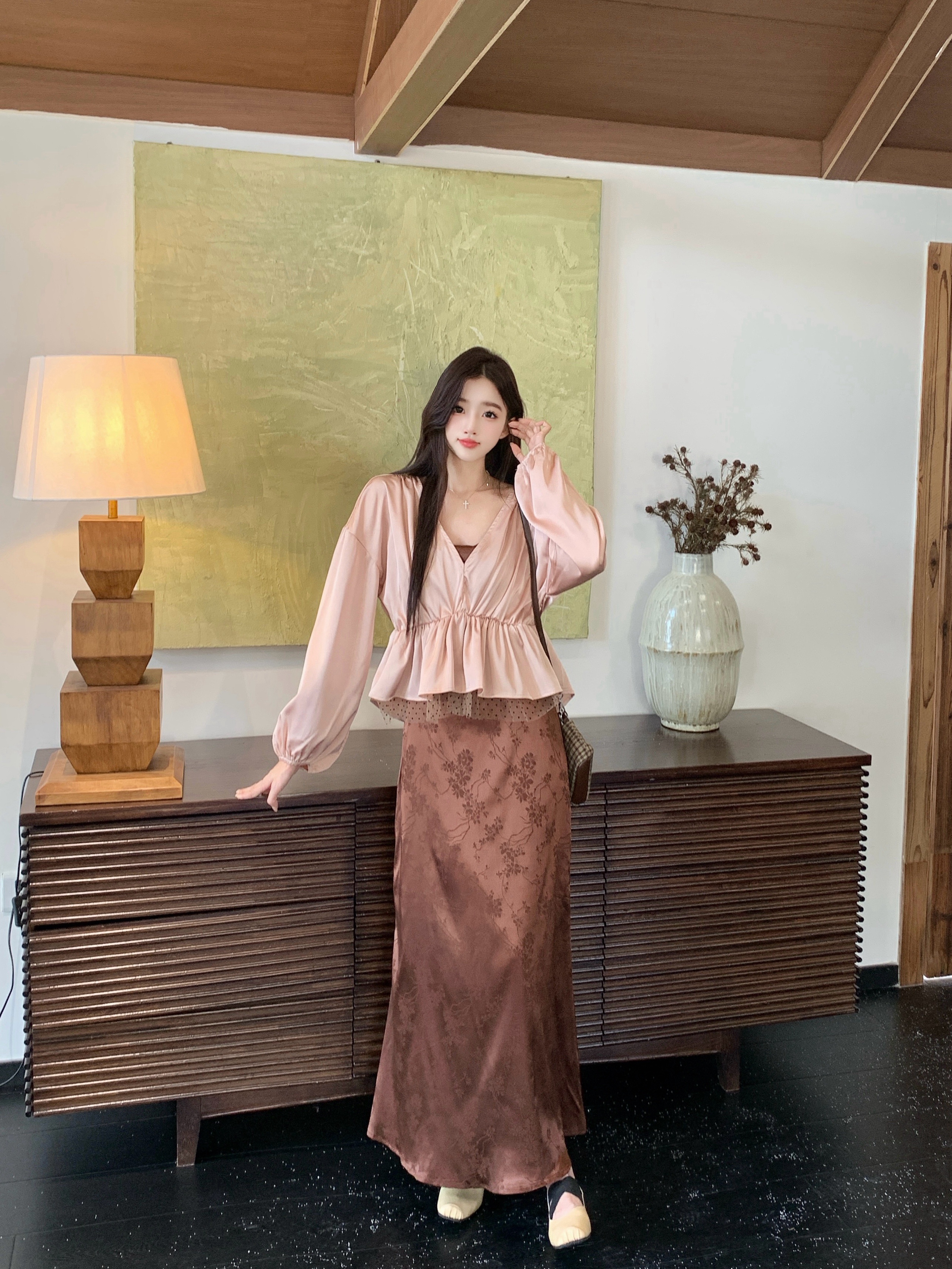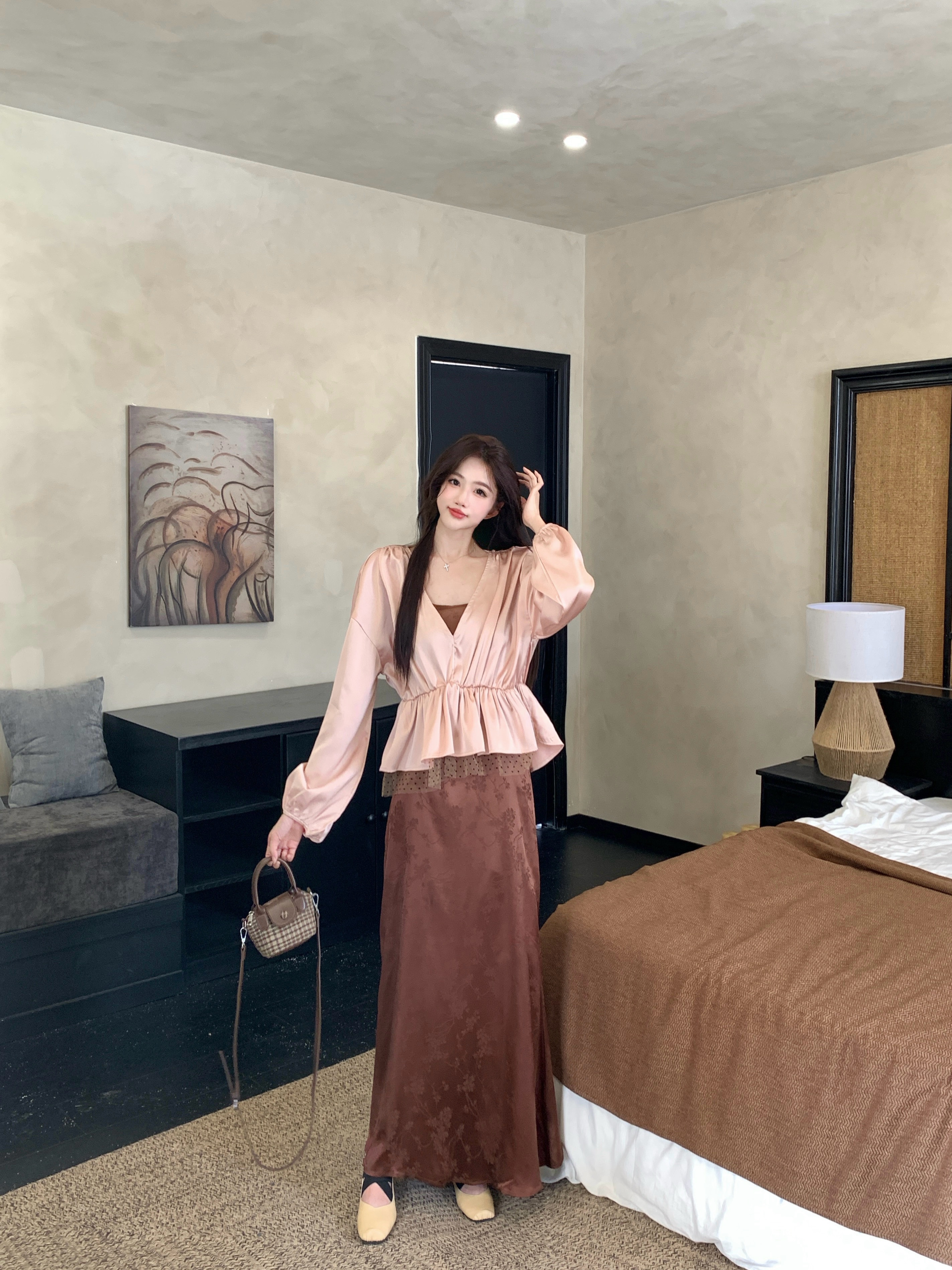 FA52771# 大码女装法式复古吊带裙荷叶边衬衫两件套胖mm显瘦时尚套装 服裝批發女裝批發服飾貨源