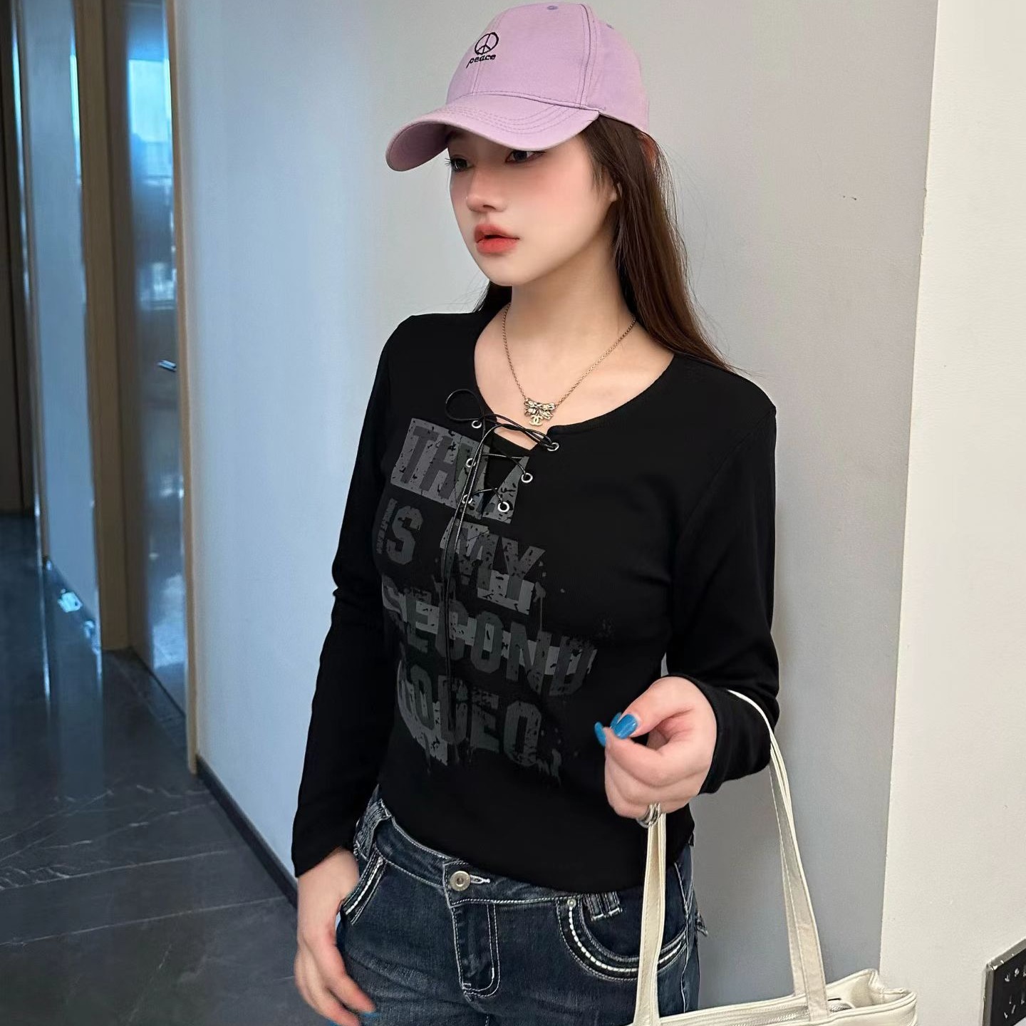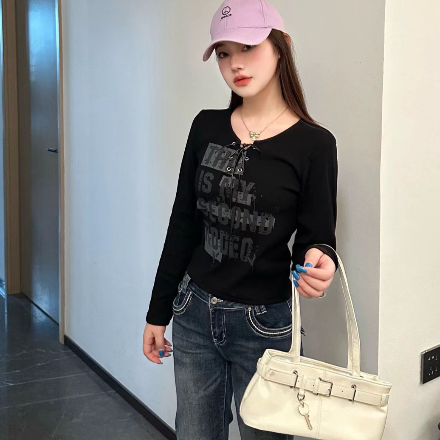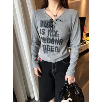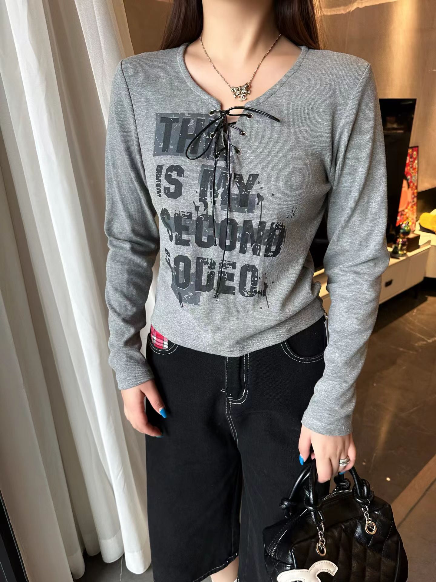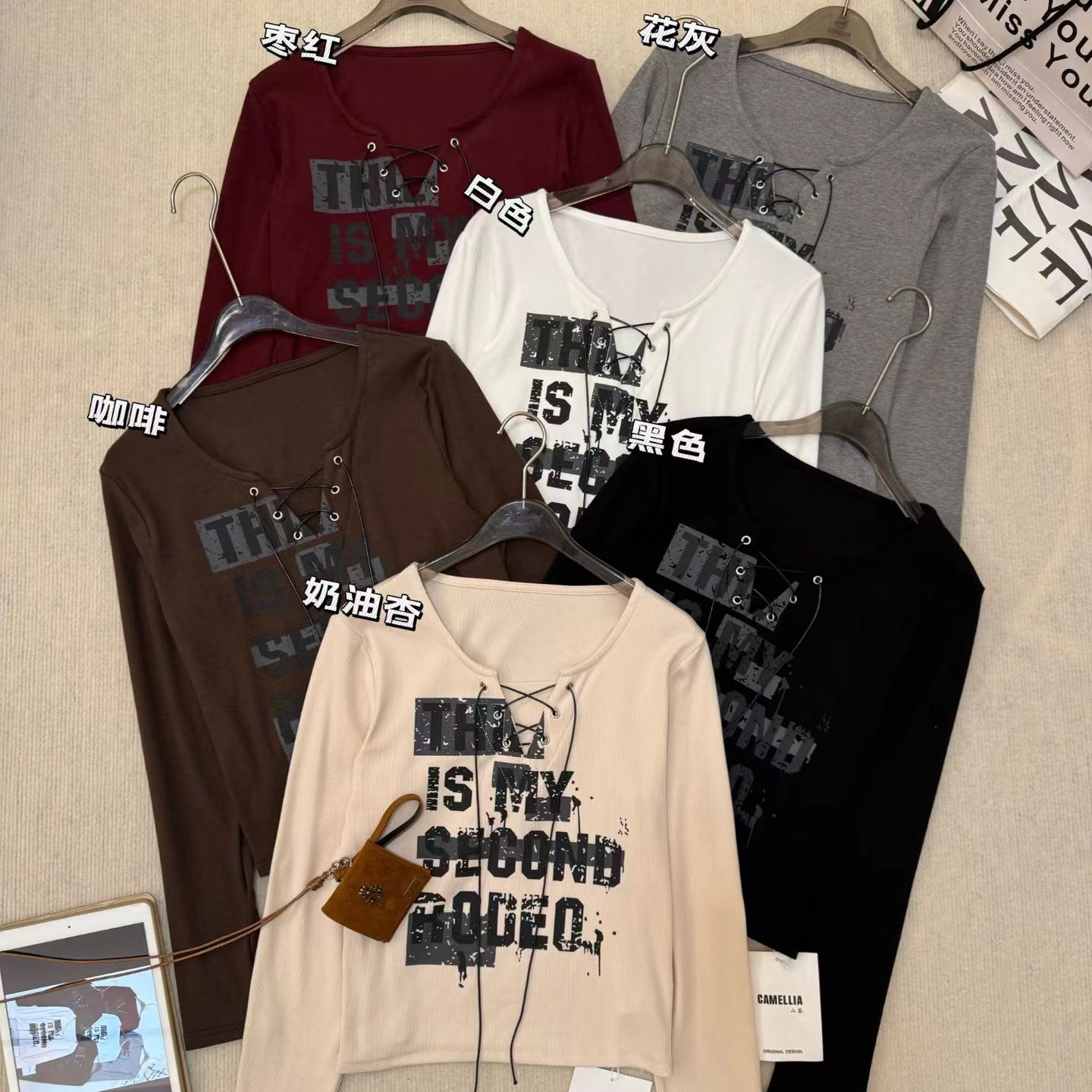 FA52857# 秋季新款韩版字母印花长袖T恤女V领短款上衣打底衫 服裝批發女裝批發服飾貨源