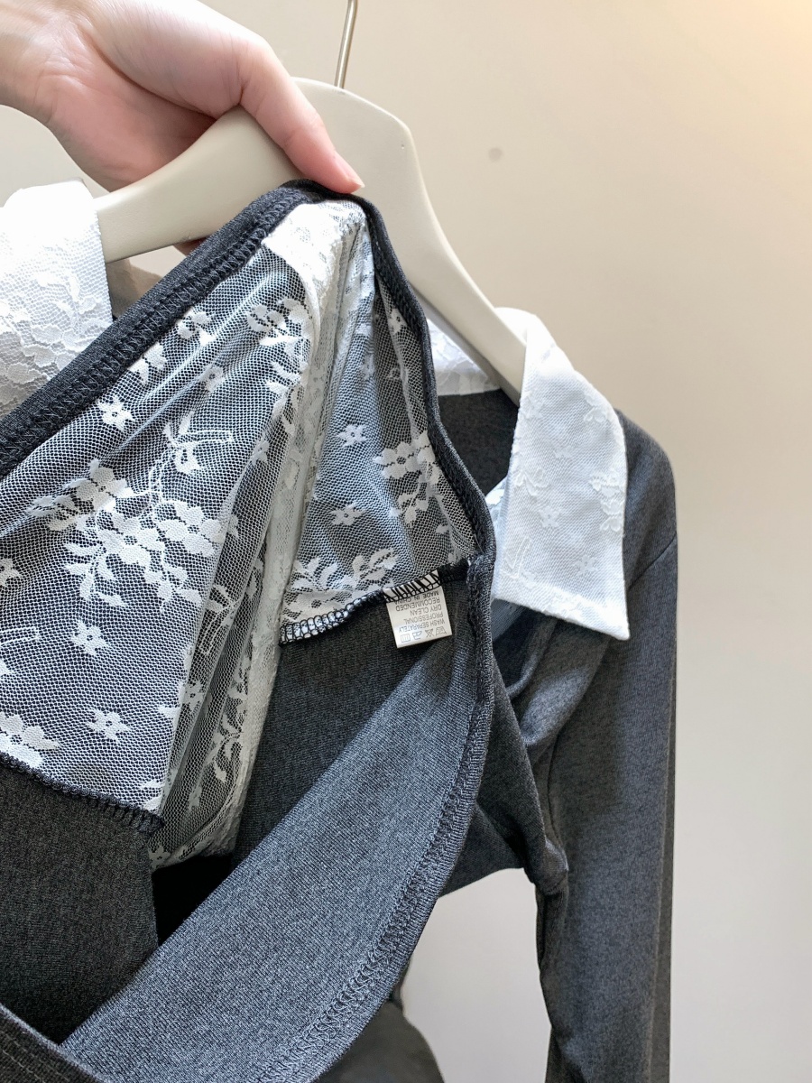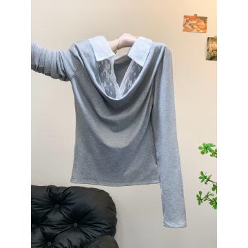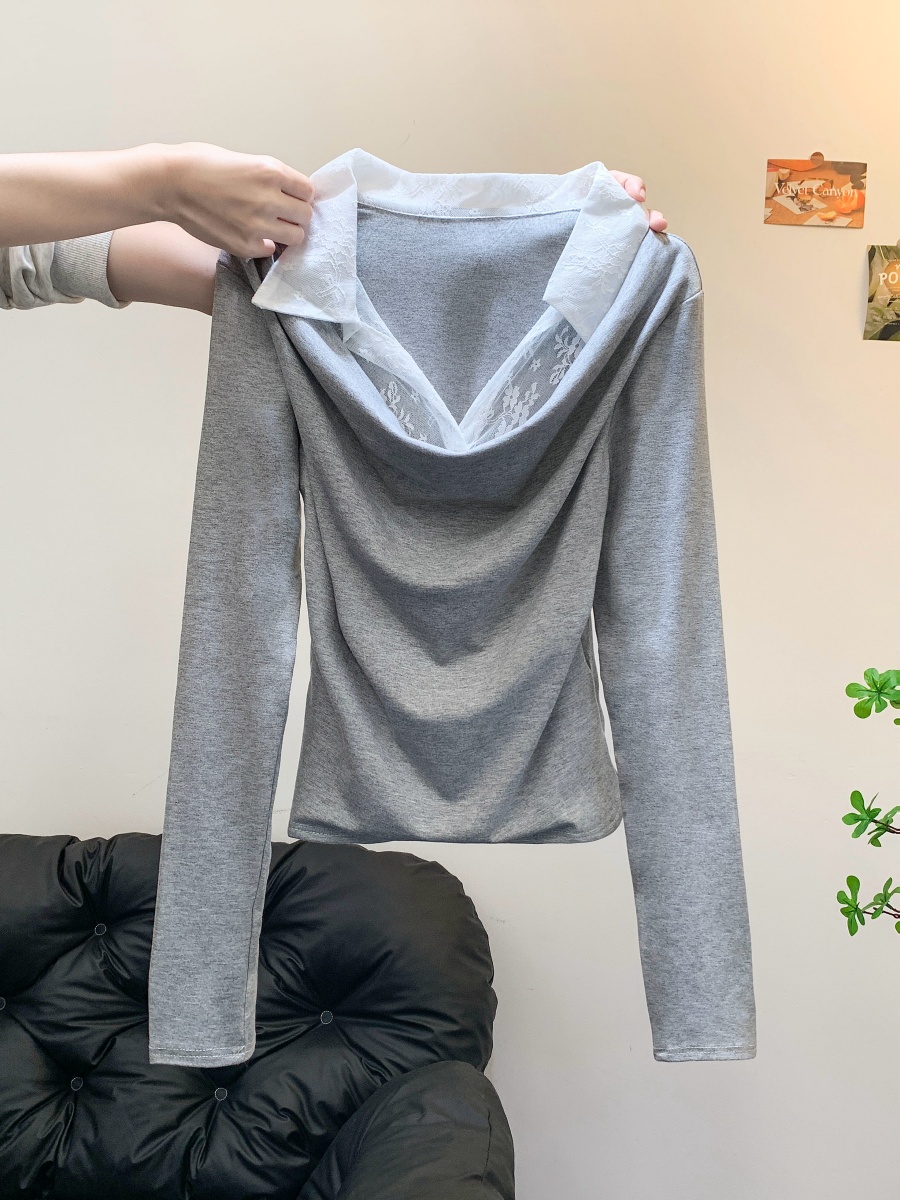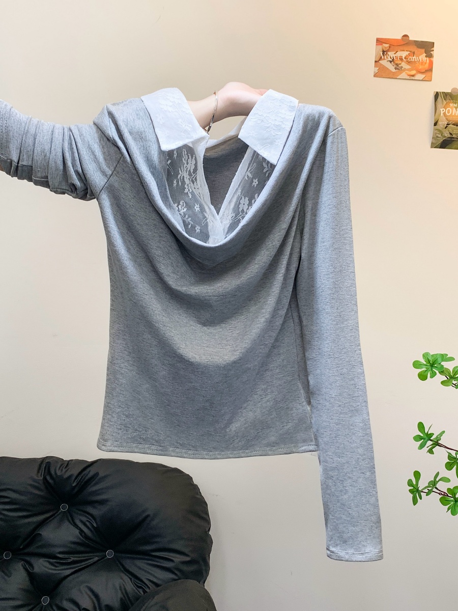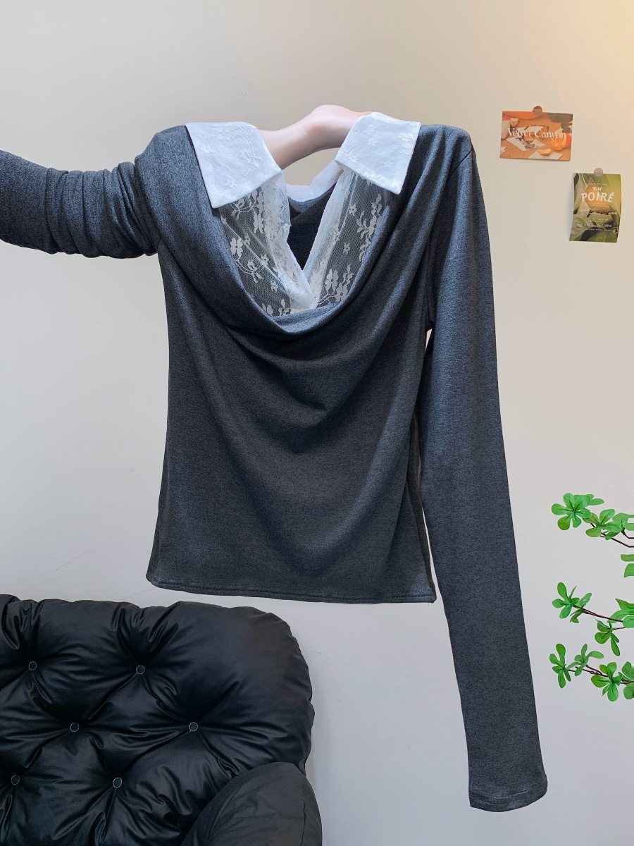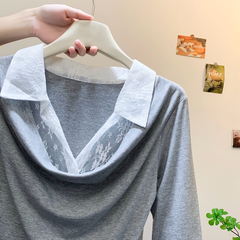 FA53224# 秋季新款韩版小众设计蕾丝拼接翻领套头修身9百搭长袖T恤 服裝批發女裝批發服飾貨源