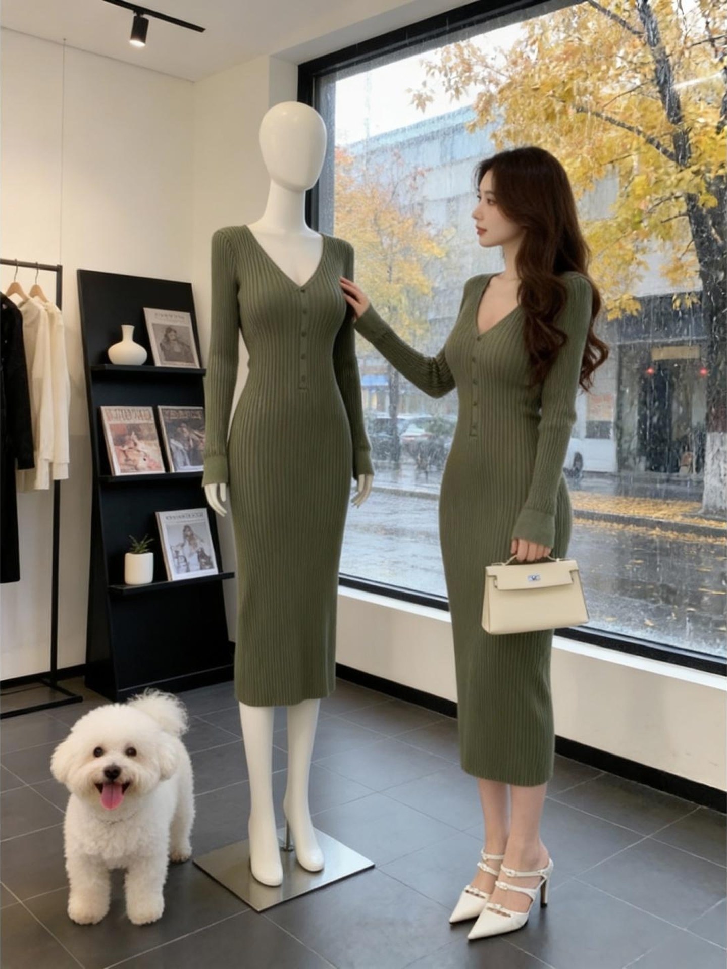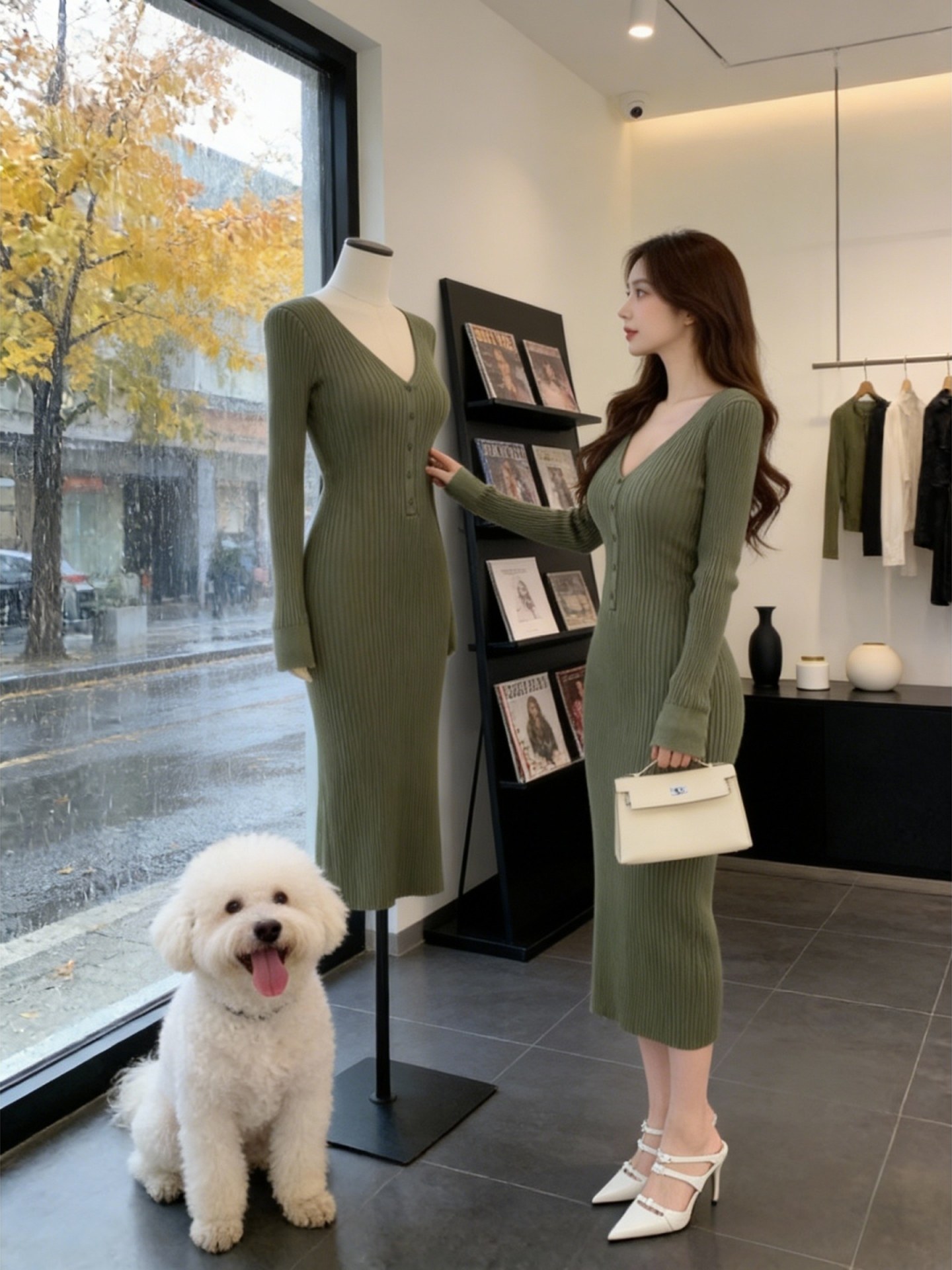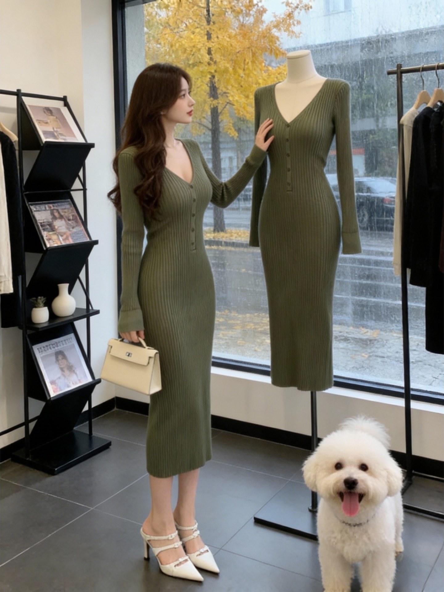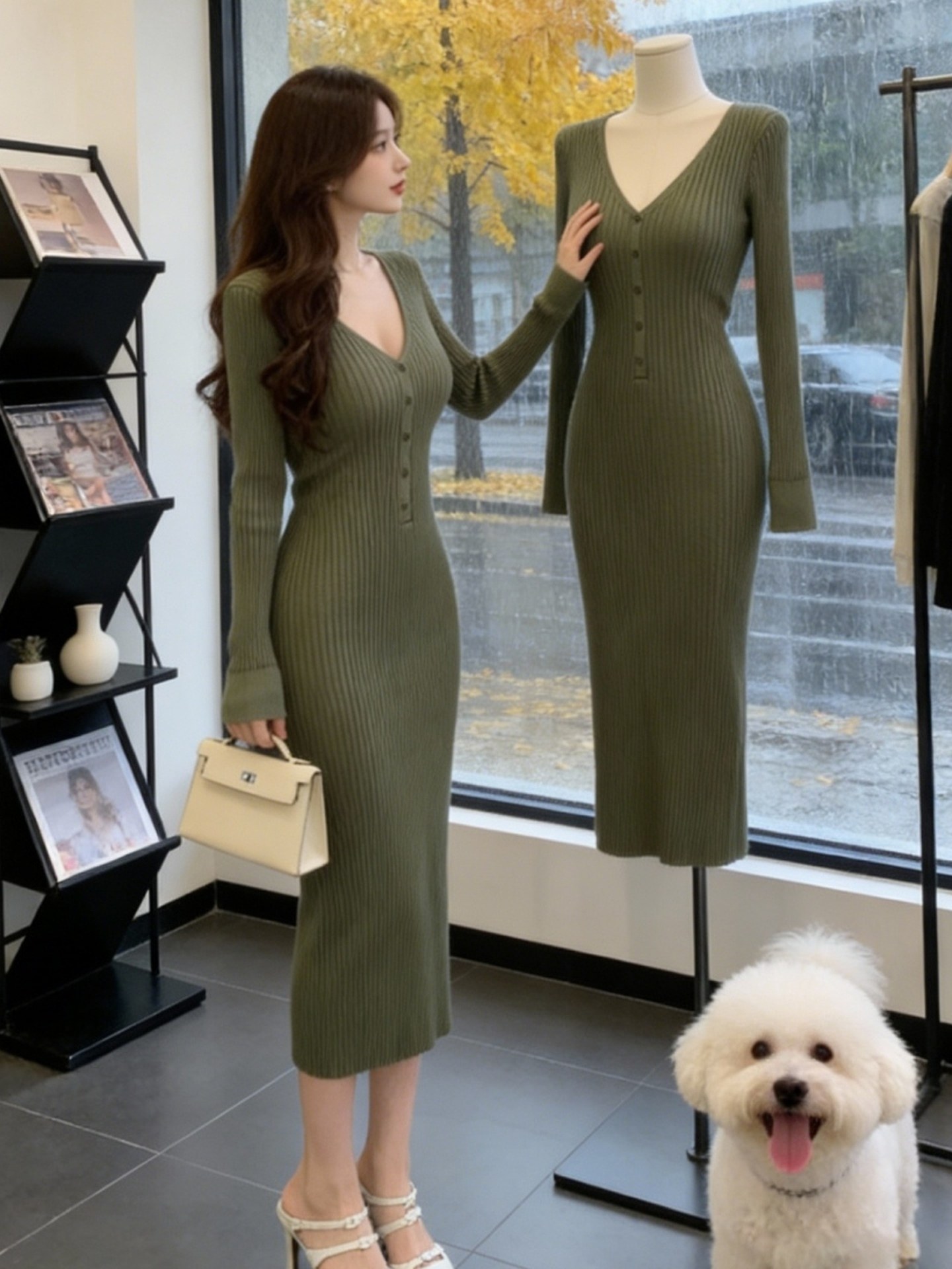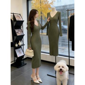 FA53228# 韩国轻熟优雅风V领针织连衣裙女早春新款设计感修身显瘦气质长裙 服裝批發女裝批發服飾貨源