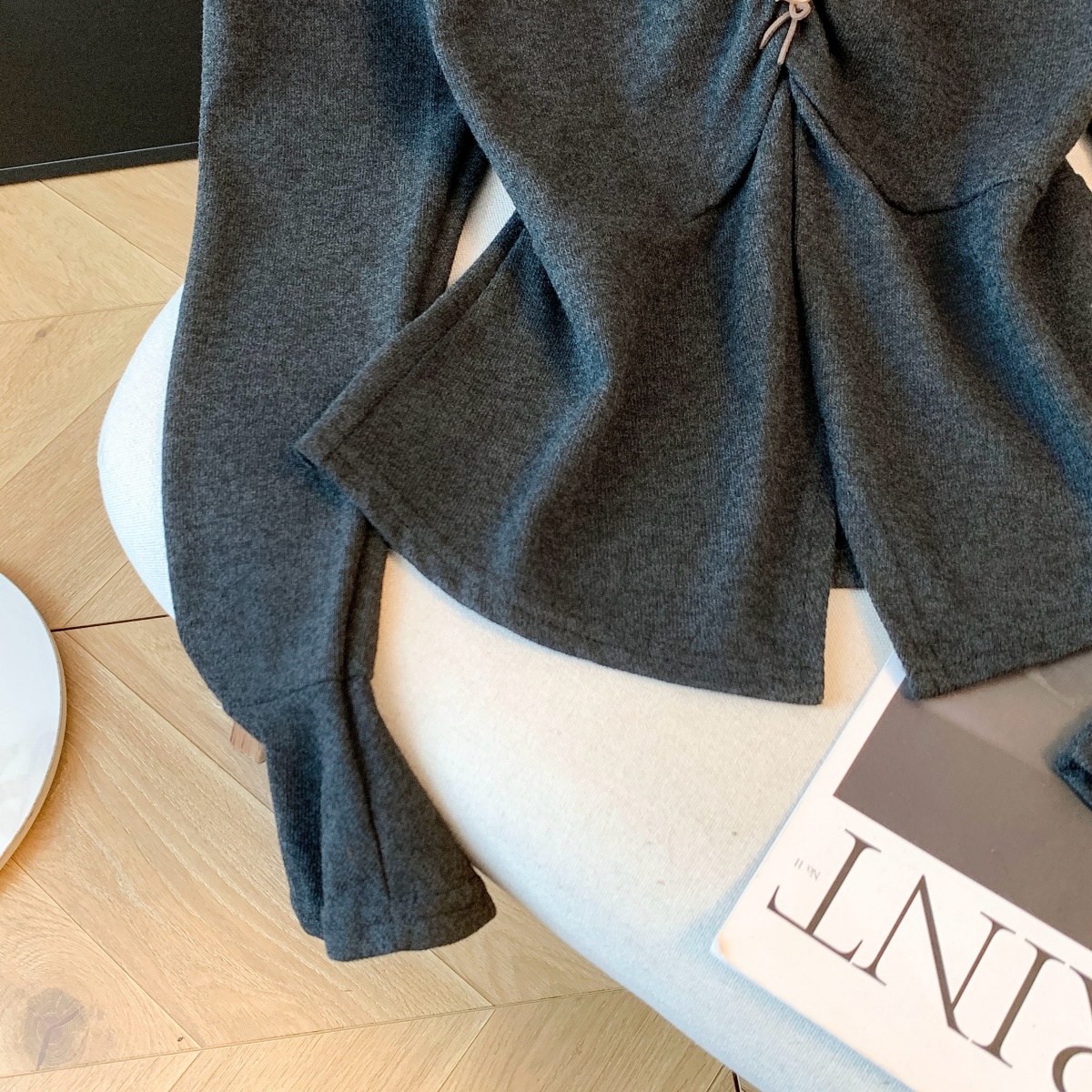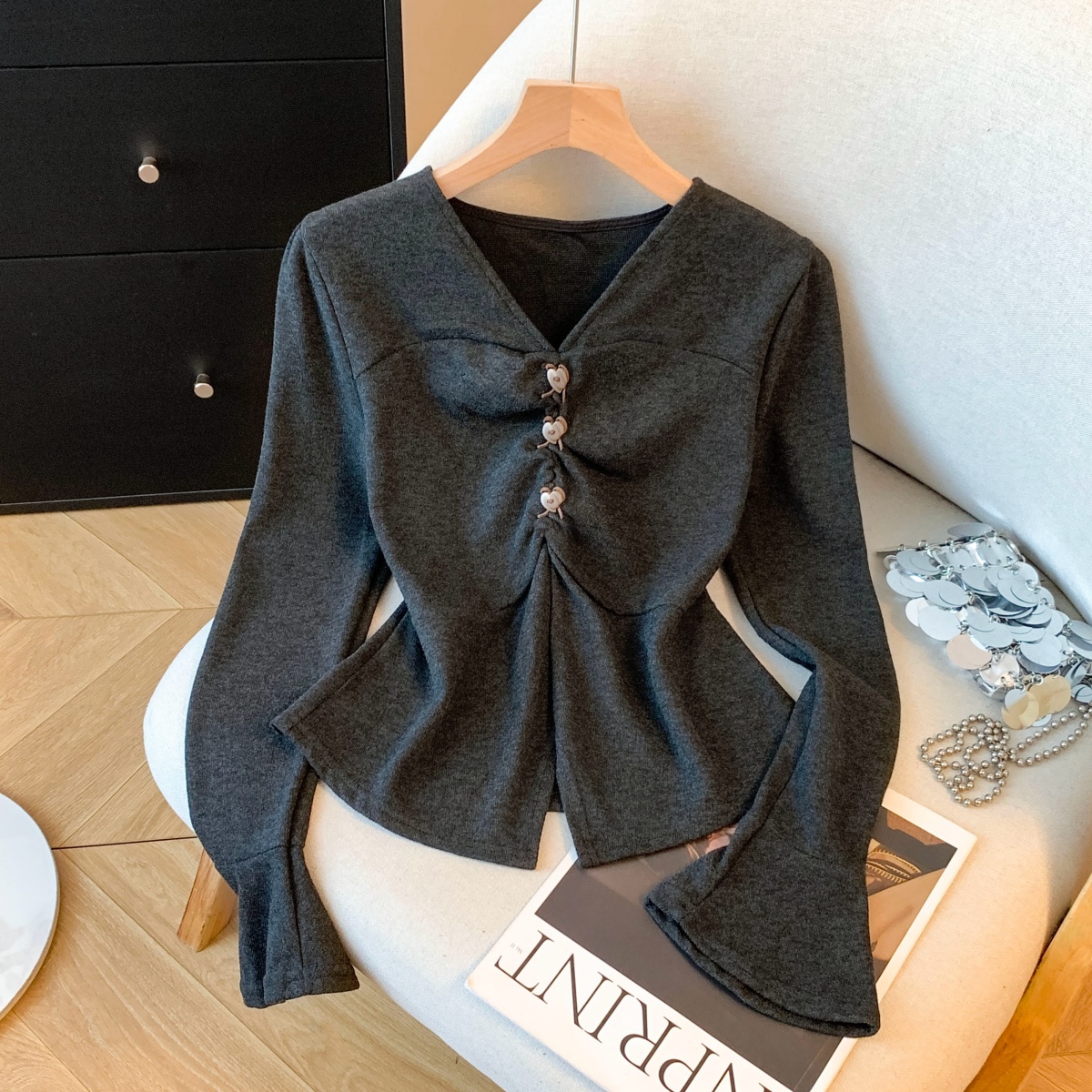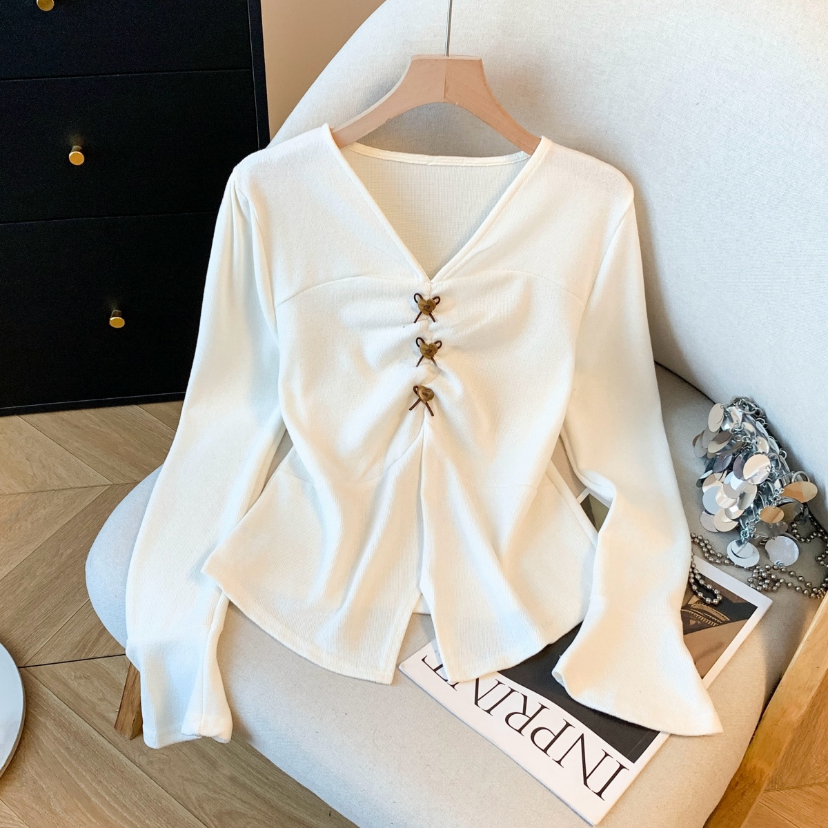 FA53230# 法式蕾丝V领喇叭长袖衬衫女春秋新款设计感短款修身上衣 服裝批發女裝批發服飾貨源