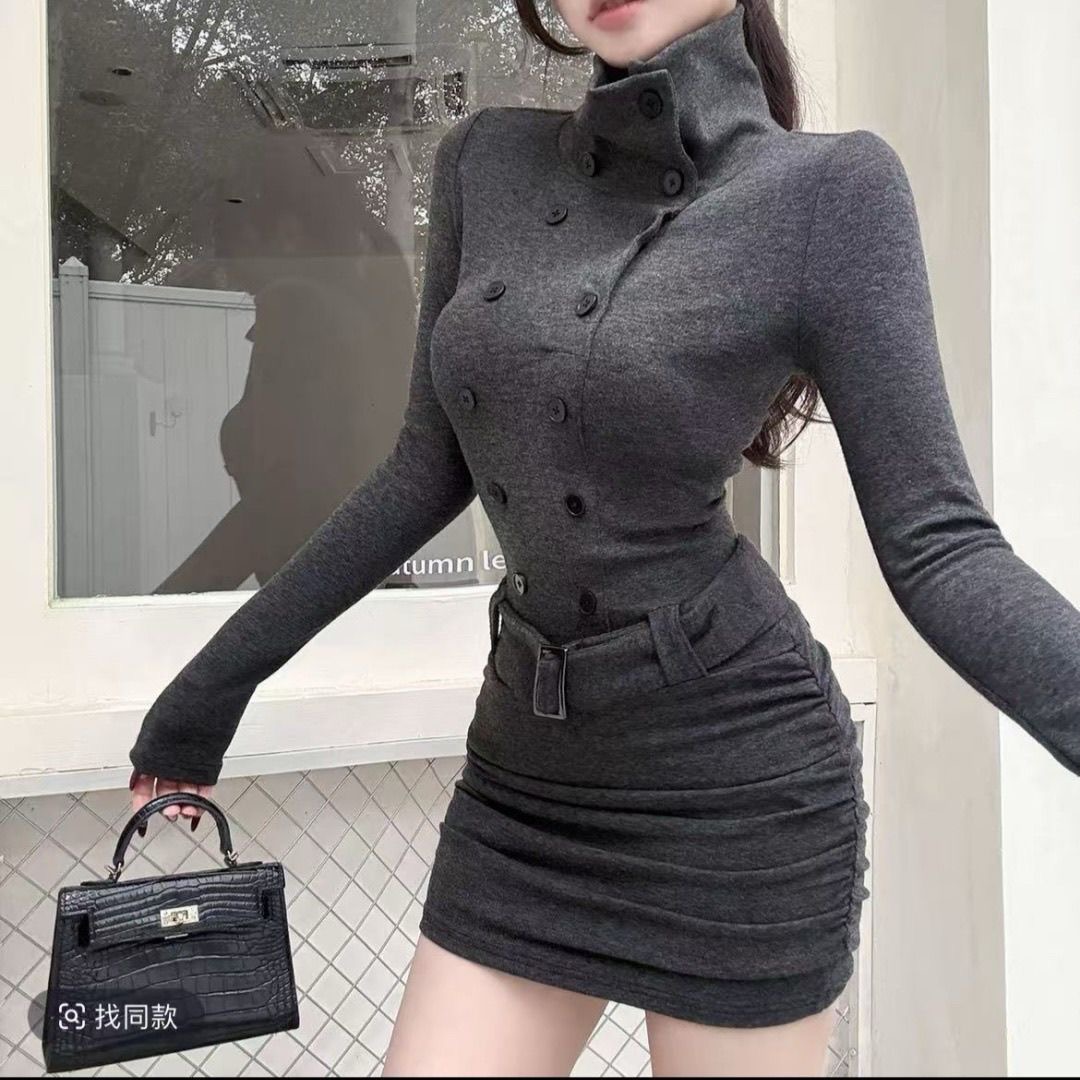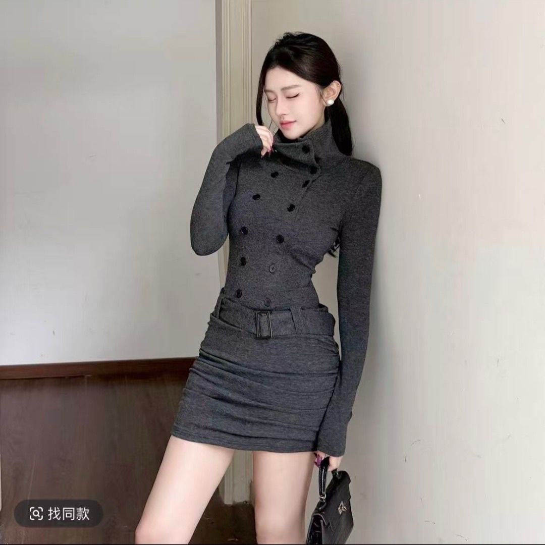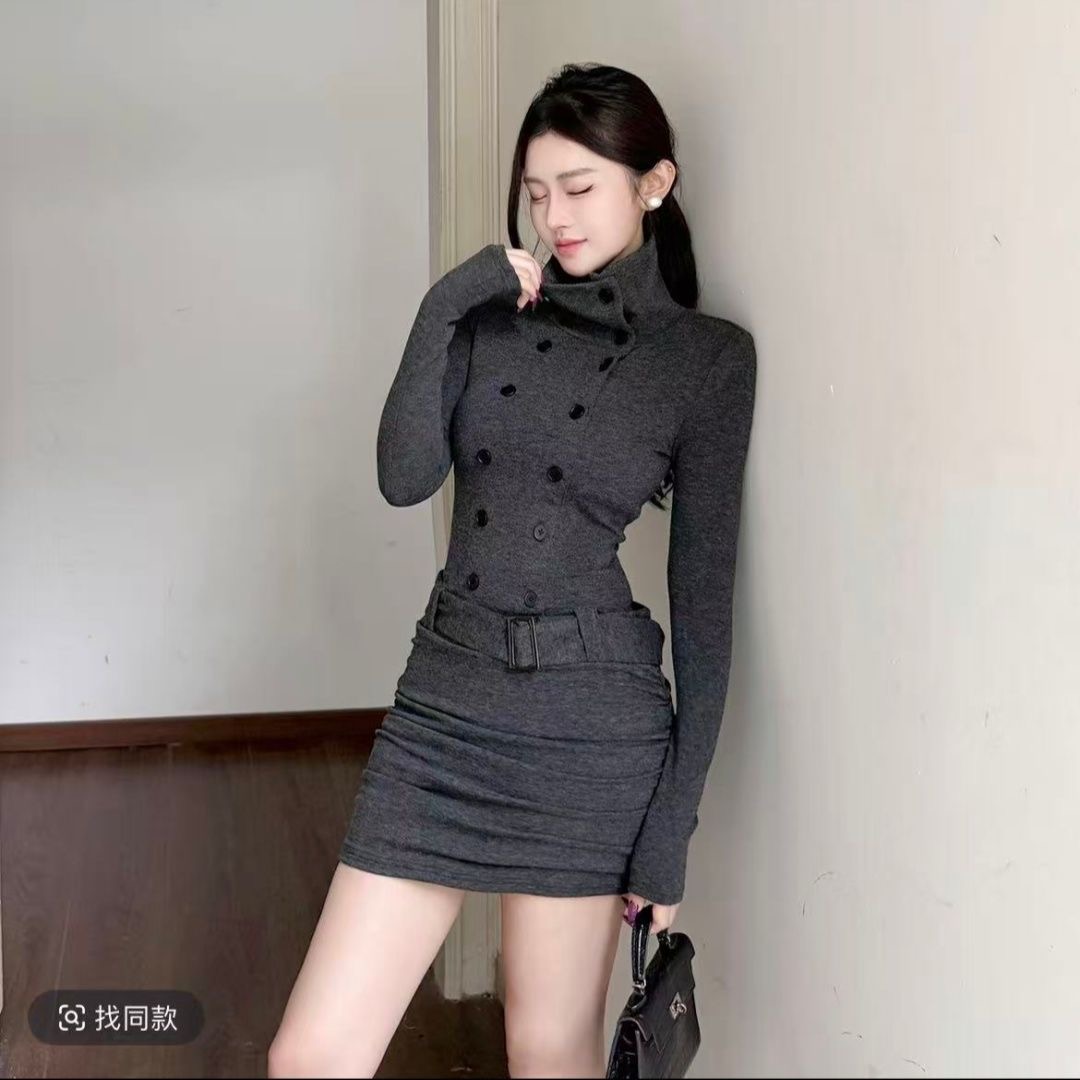 FA53246# 辣妹风高领纽扣显瘦收腰长袖连衣裙秋冬气质修身包臀褶皱打底短裙 服裝批發女裝批發服飾貨源