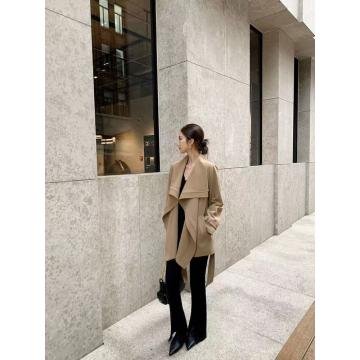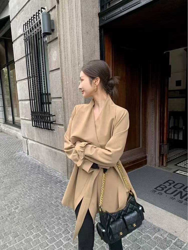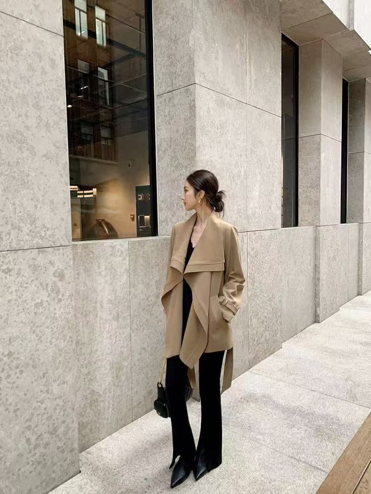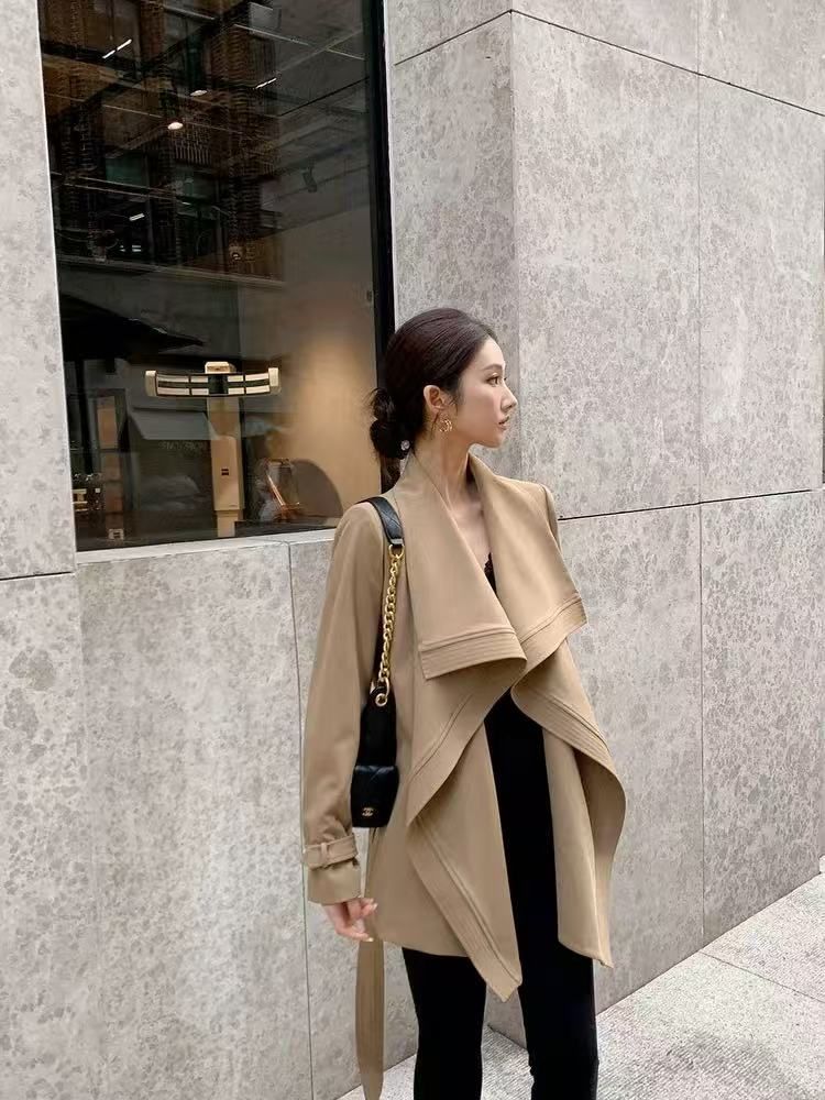 FA53306# 卡其色气质短款风衣女秋季新款宽松翻领系带 服裝批發女裝批發服飾貨源