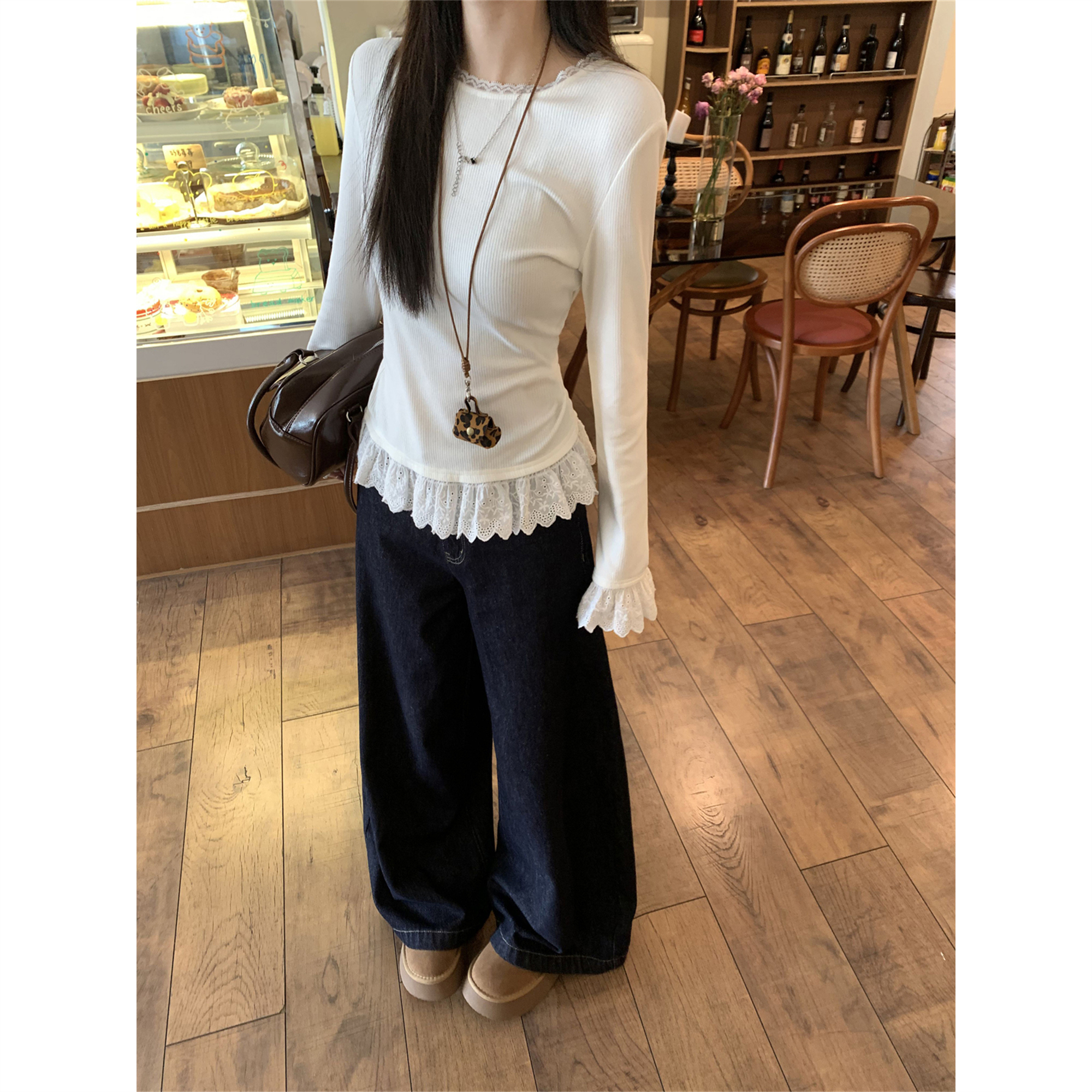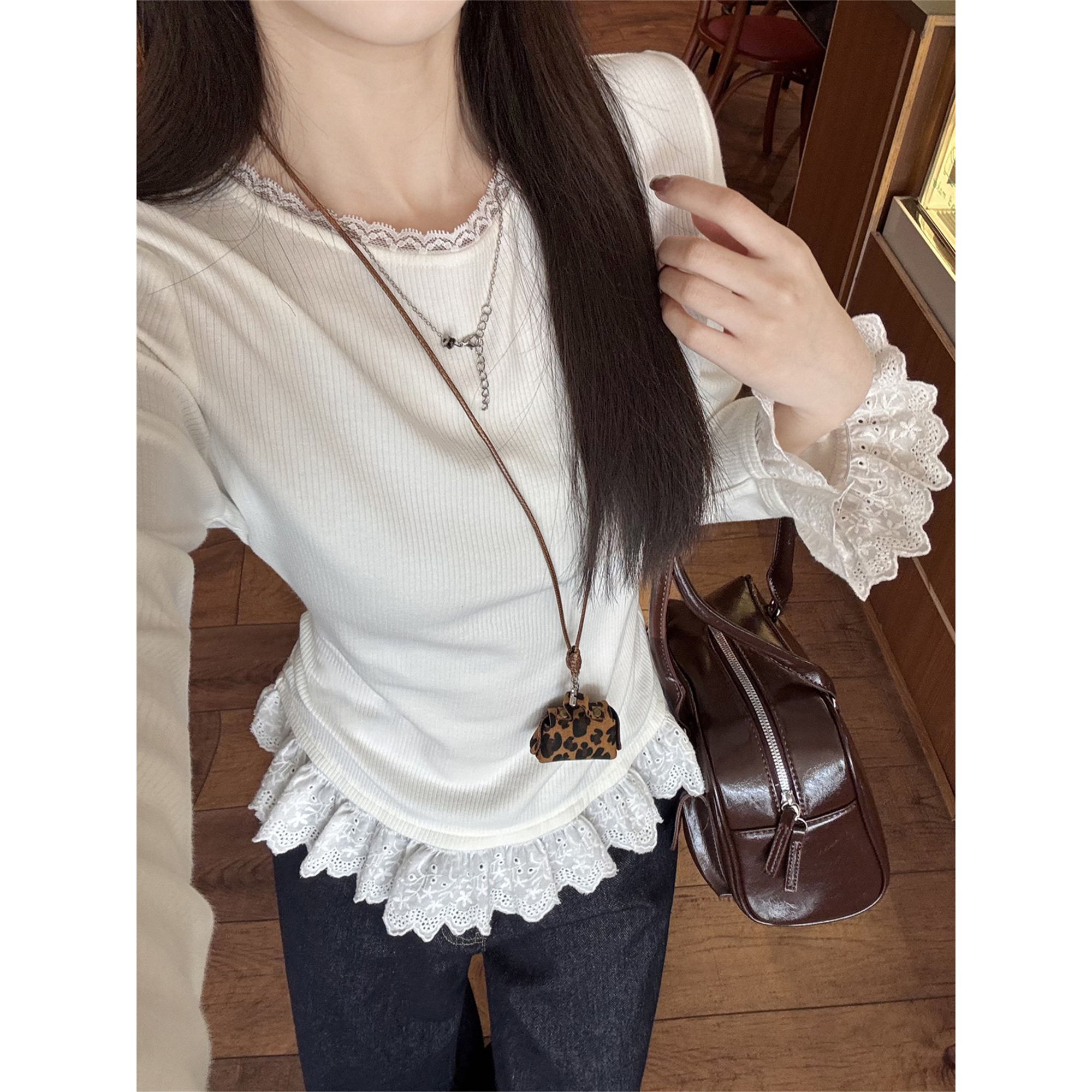 FA53437# 韩系木耳边圆领长袖打底衫女秋冬款长袖内搭蕾丝花边下摆t恤上衣 服裝批發女裝批發服飾貨源