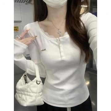 FA53439# 原版好面料韩系蕾丝拼接长袖正肩T恤女秋季修身内搭上衣 服裝批發女裝批發服飾貨源