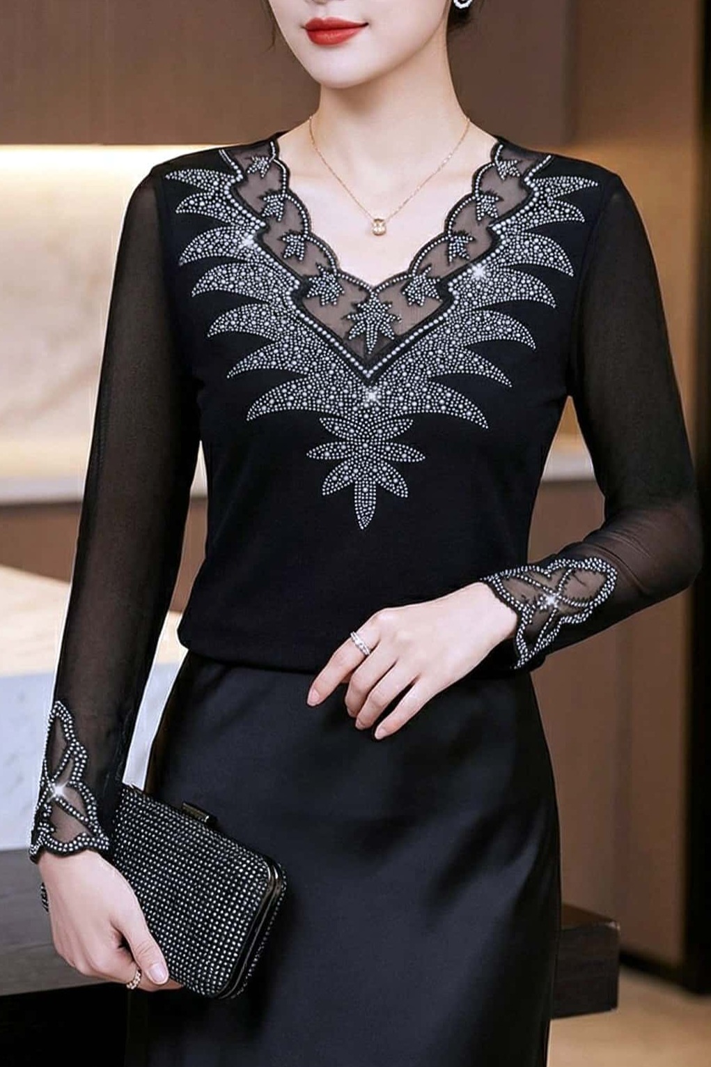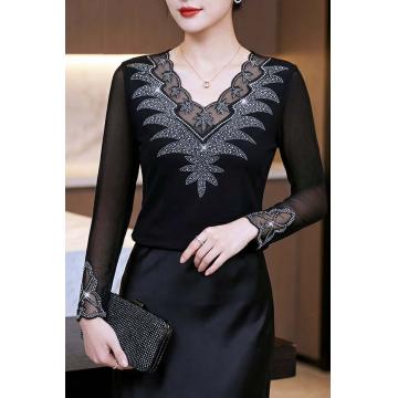 FA53524# 春季新款长袖v领上衣优雅花边拼接烫钻网纱收腰上衣