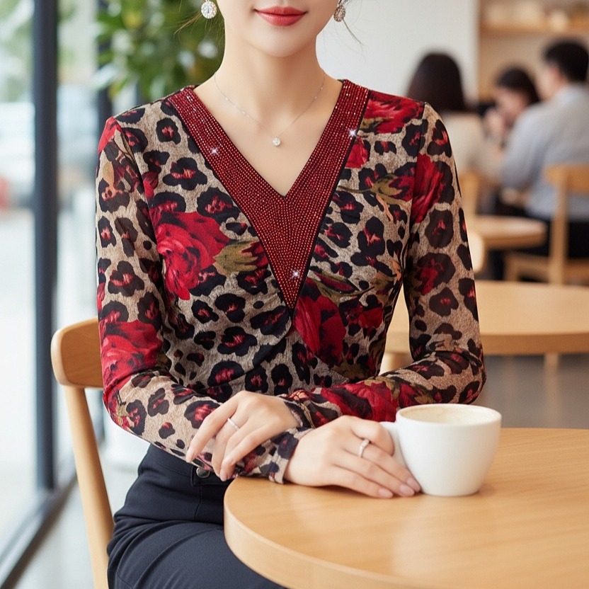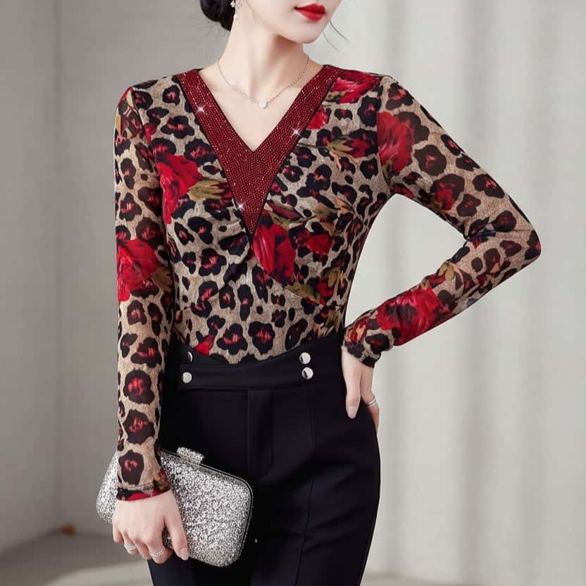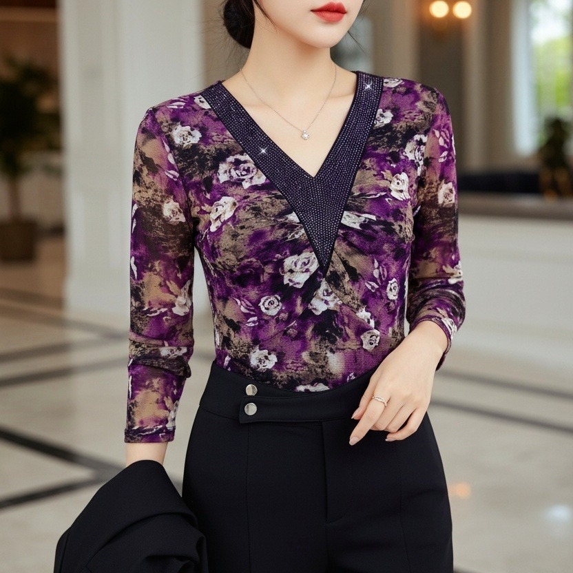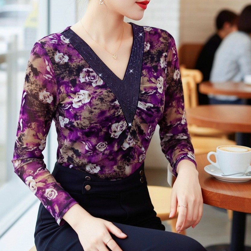 FA53526# 春季新款v领长袖上衣网纱花卉印花优雅气质收腰显瘦上衣