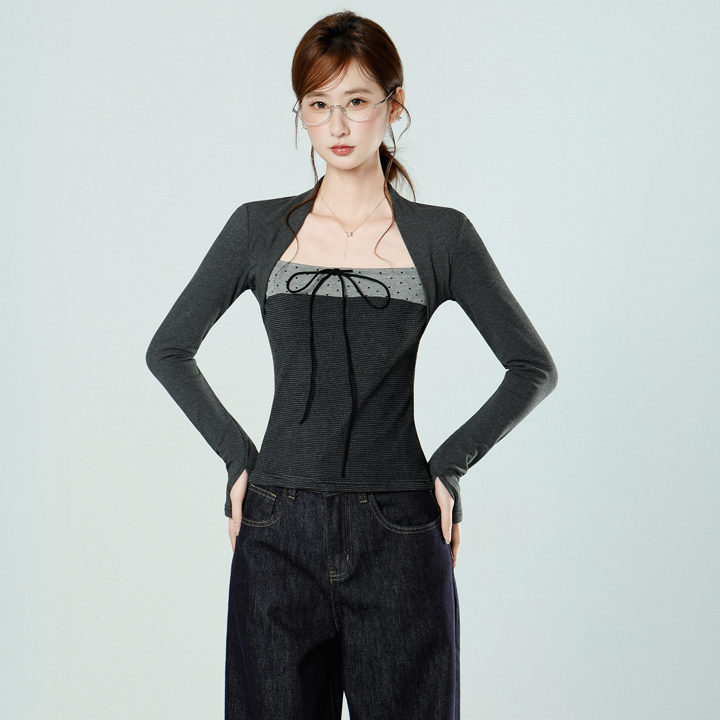 FA53560# 蝴蝶结系带假两件长袖T恤女秋冬设计感修身显瘦条纹上衣