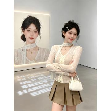 FA53586# 春款纯欲性感蕾丝捏褶花边收腰显瘦上衣T恤女上衣+飘带