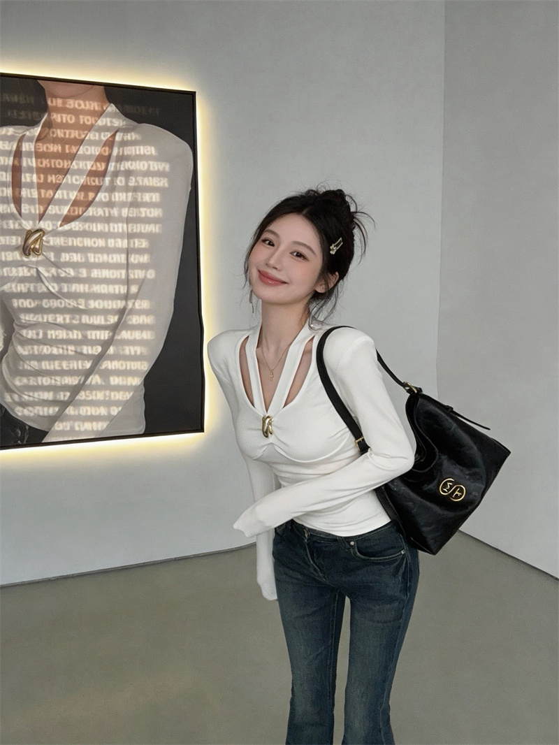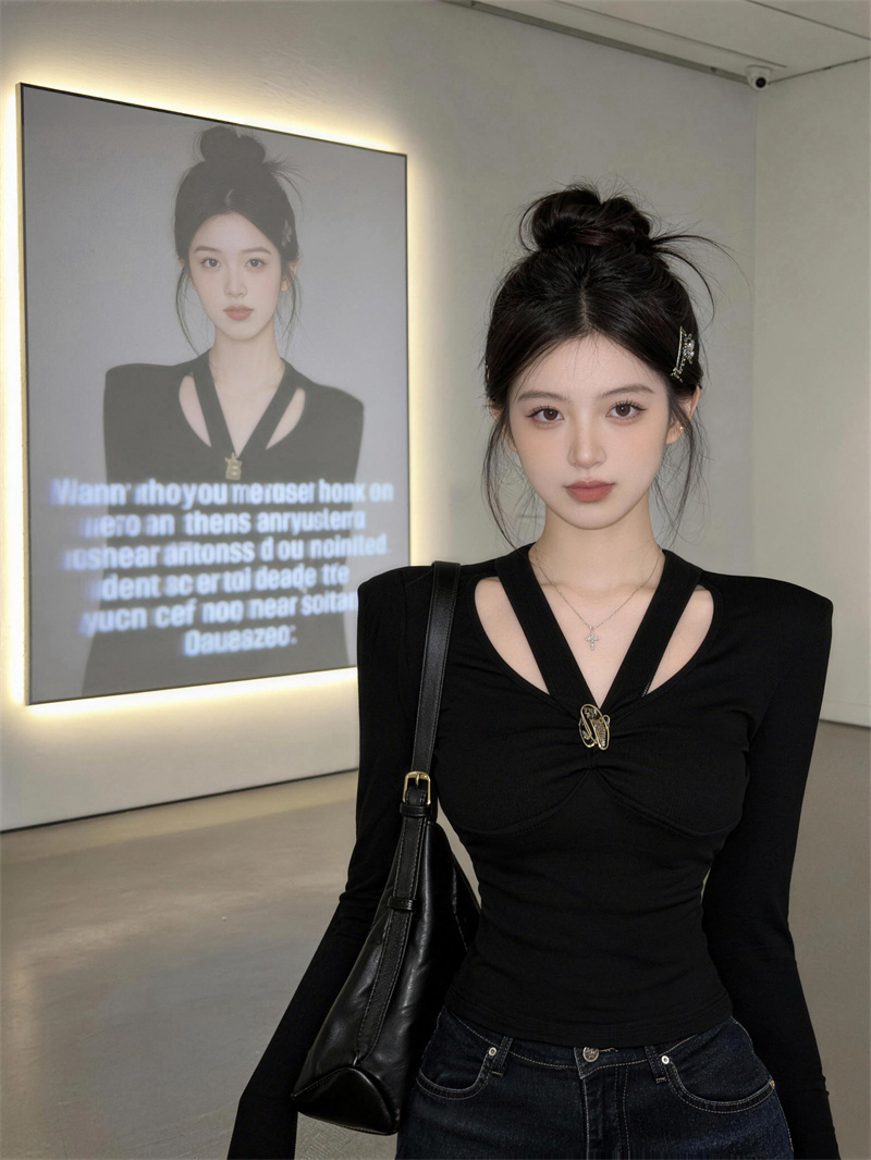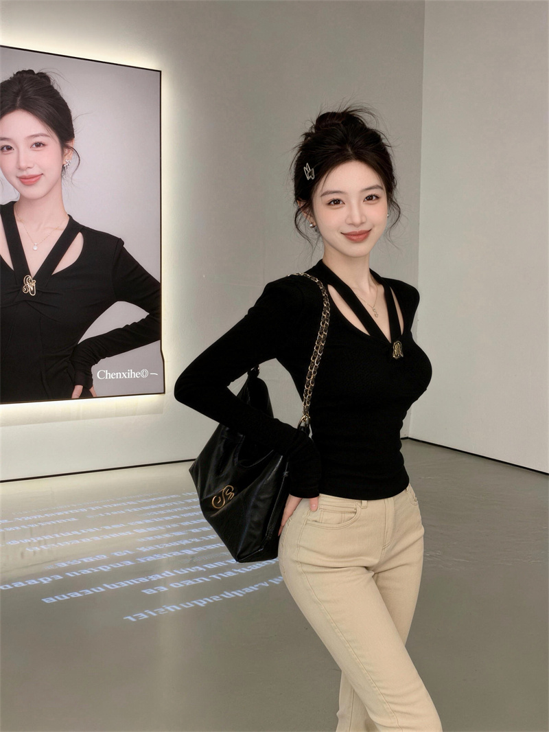 FA53588# 春上新纯欲设计挂脖V领长袖T恤女修身显瘦上衣打底衫女