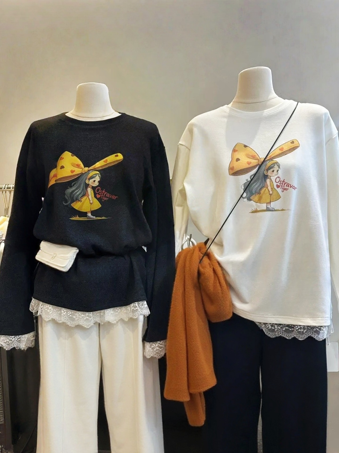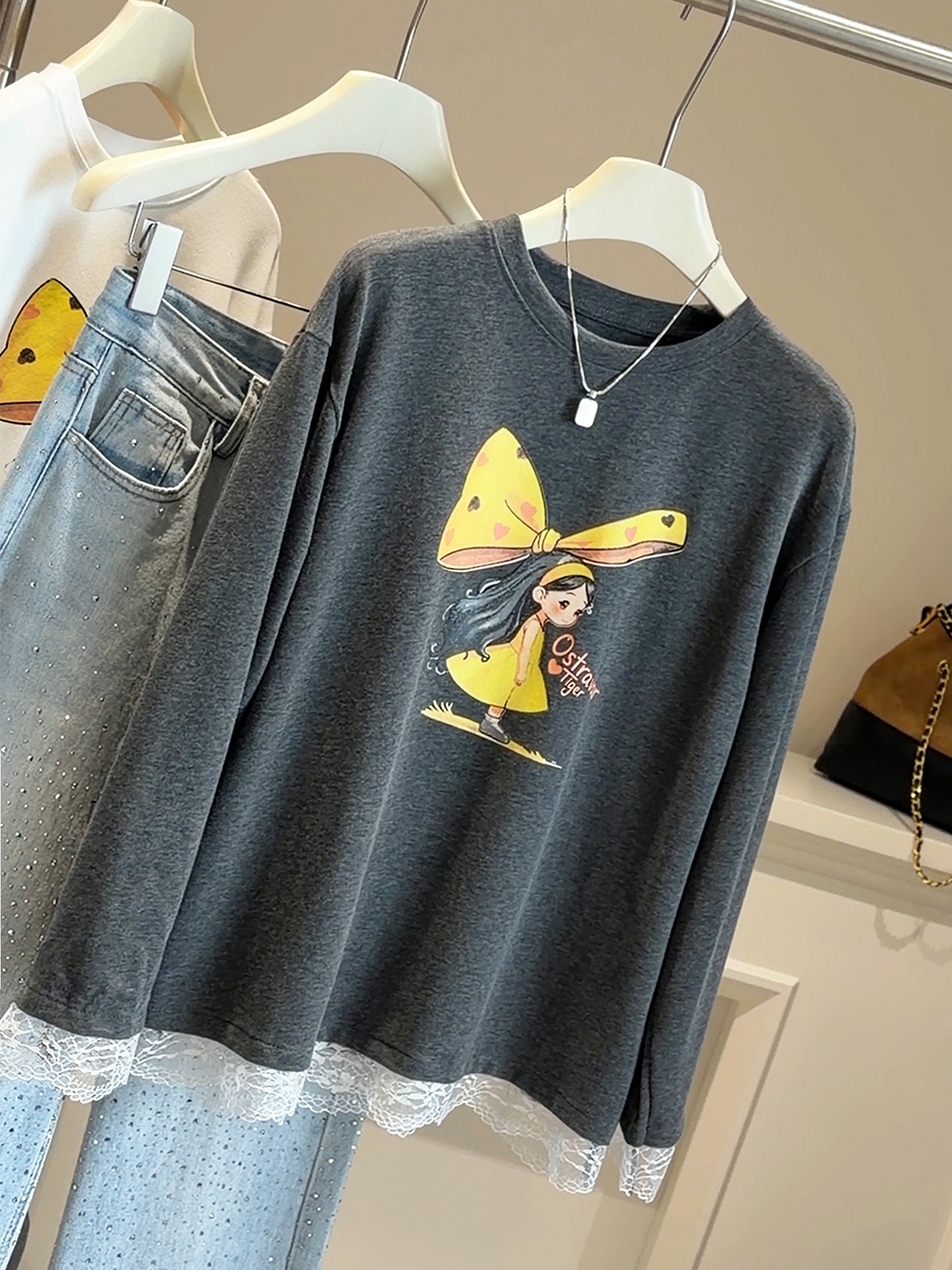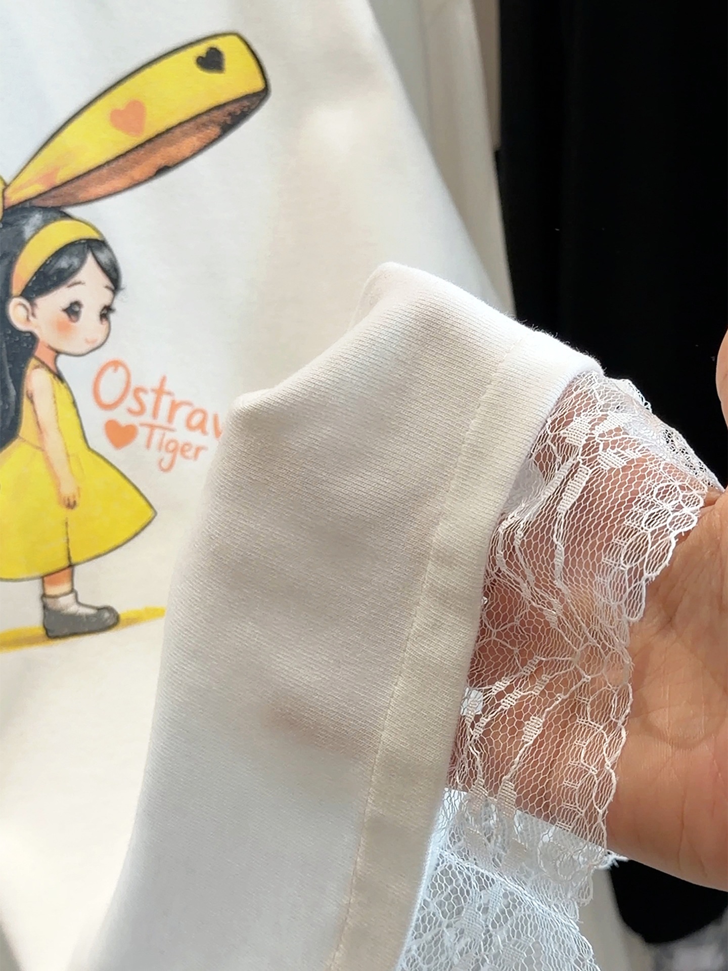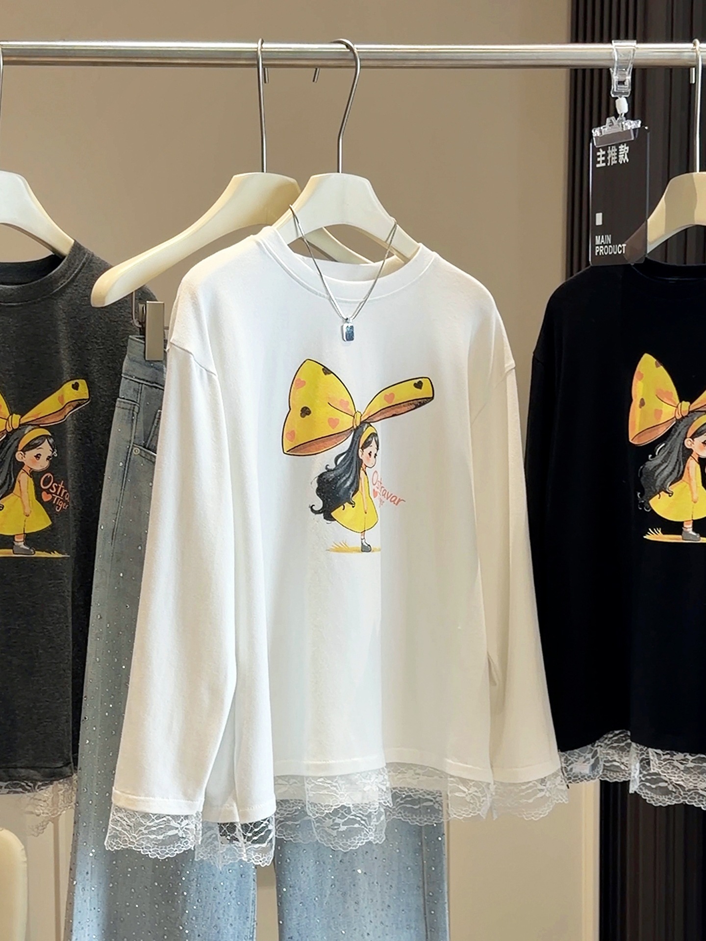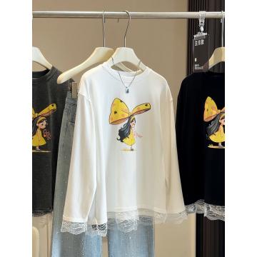 FA53641# 韩版减龄蕾丝拼接可爱卡通蝴蝶结女孩长袖宽松T恤女春季新款上衣