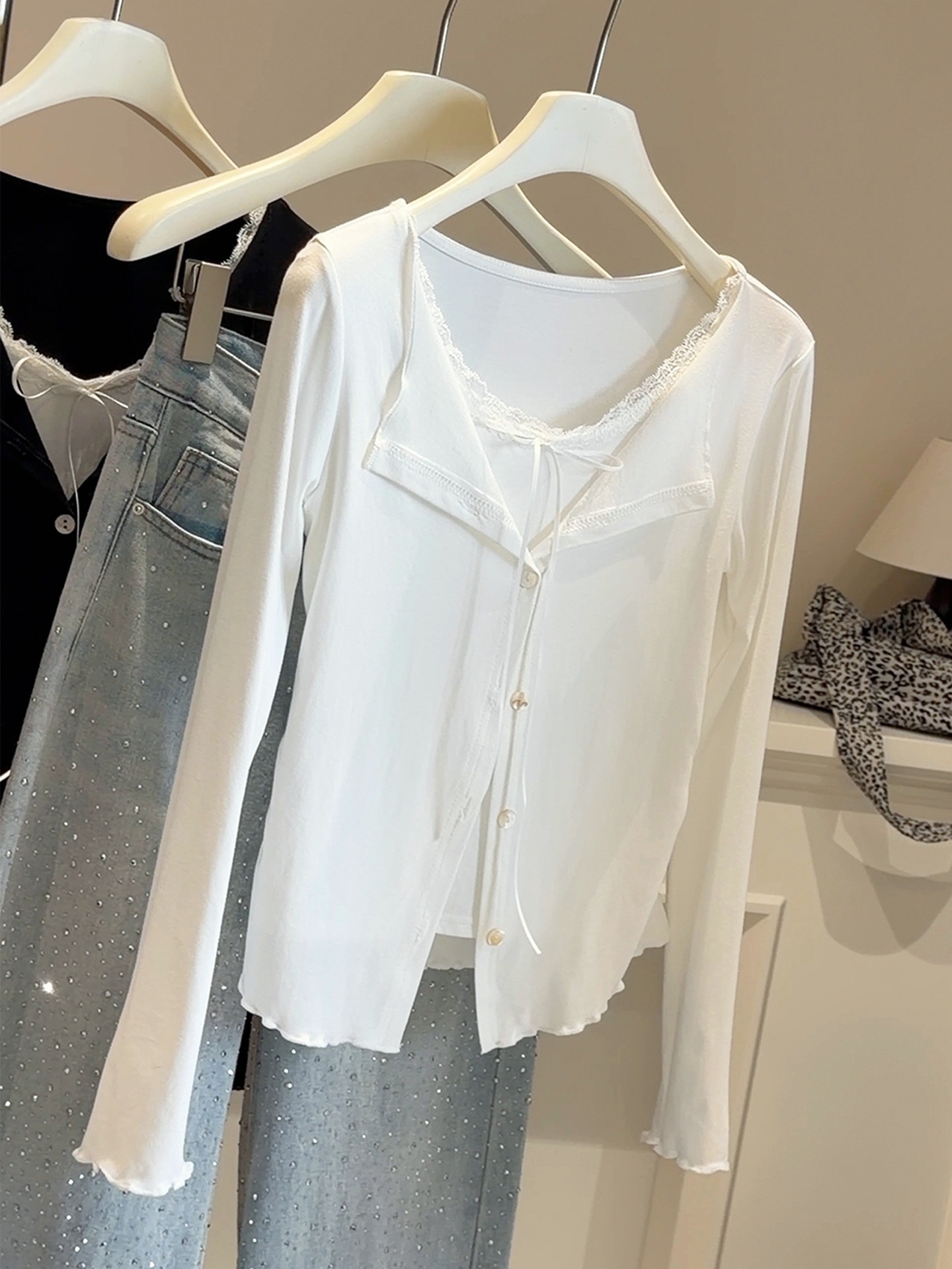 FA53643# 韩系假两件木耳边翻领长袖T恤女春新款修身显瘦内搭打底开衫上衣