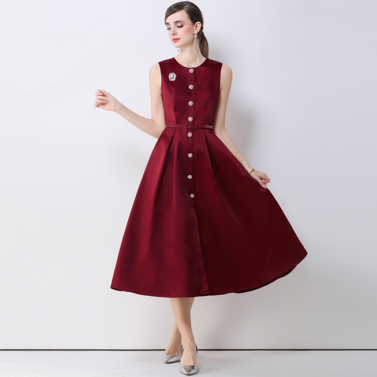 FA53773# 优雅轻奢风圆领无袖排扣连衣裙女收腰显瘦A字连衣裙送腰带 服裝批發女裝批發服飾貨源