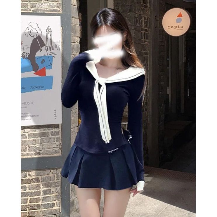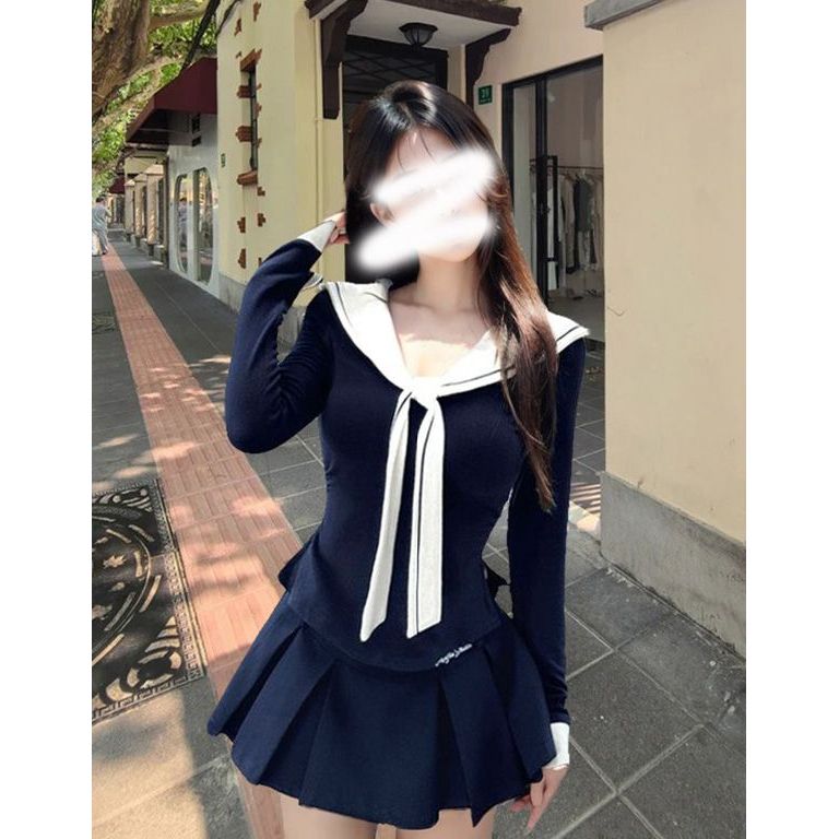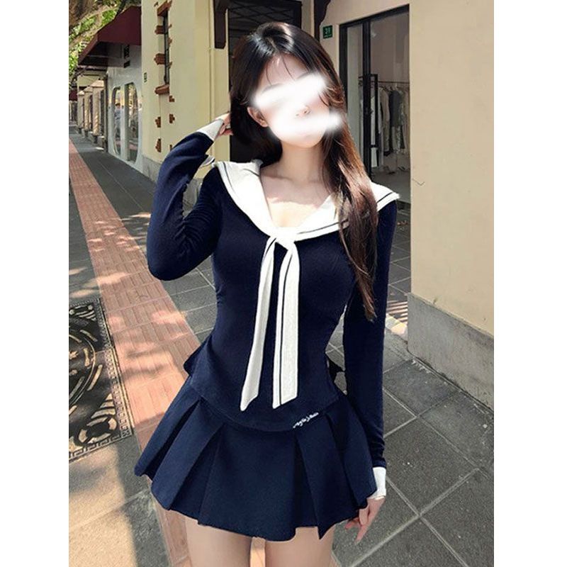 LN76424# 可爱甜美风海军领上衣套装女早秋设计感拼接打底衫高腰百褶半身裙