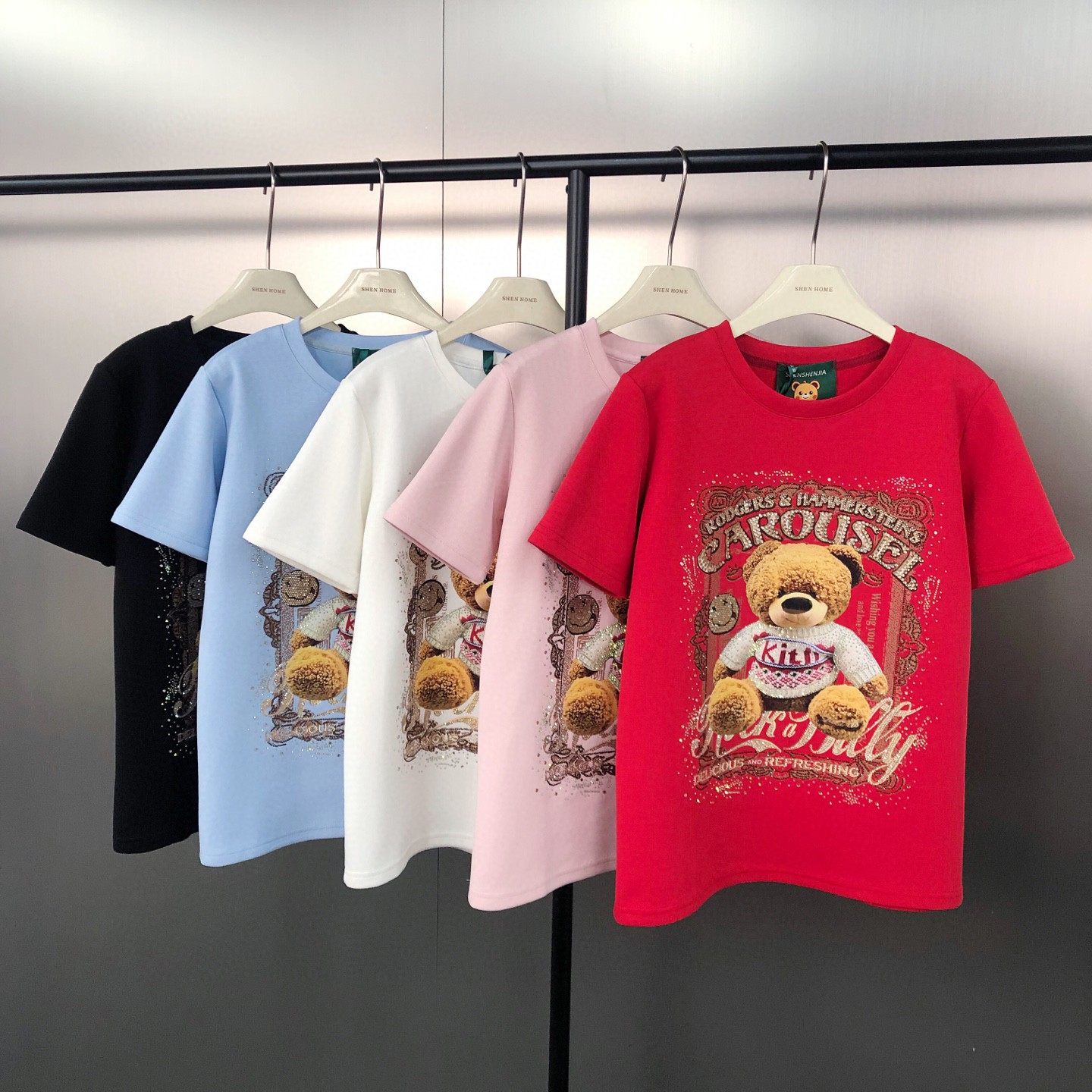 FA53887# 早春!韩版洋气设计感手工烫砖小熊印花潮流短袖T恤 服裝批發女裝批發服飾貨源