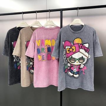 FA53897# 早春!甜酷时尚重工珠片KT猫印花宽松百搭洗水短袖T恤 服裝批發女裝批發服飾貨源