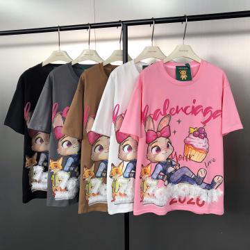 FA53900# 早春!韩系设计感蕾丝花边手缝字母卡通朱迪印花减龄休闲短袖T恤 服裝批發女裝批發服飾貨源