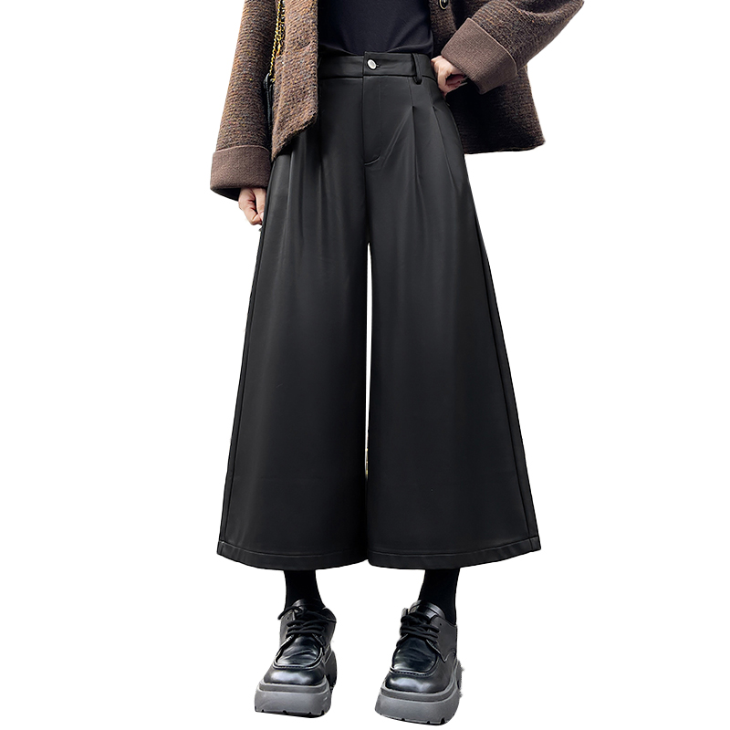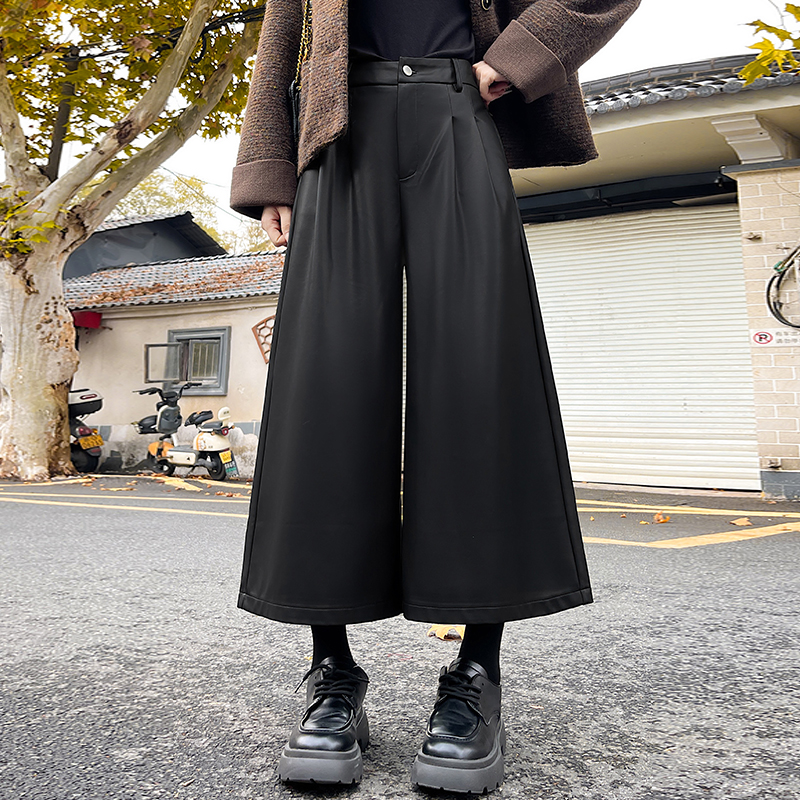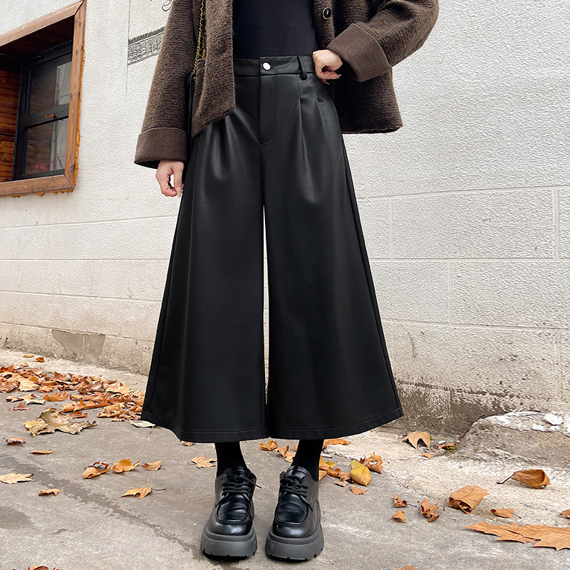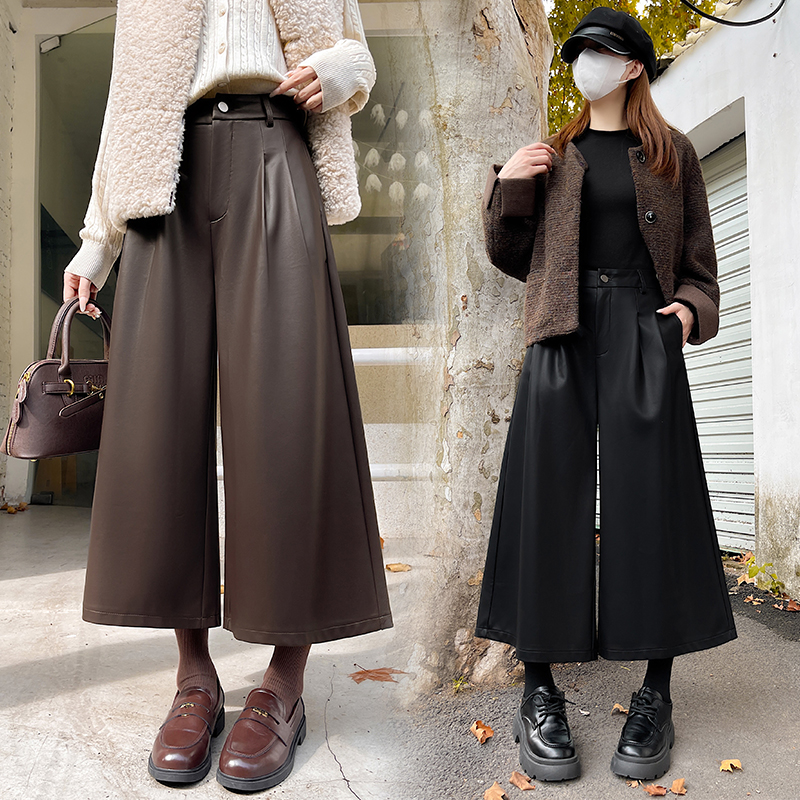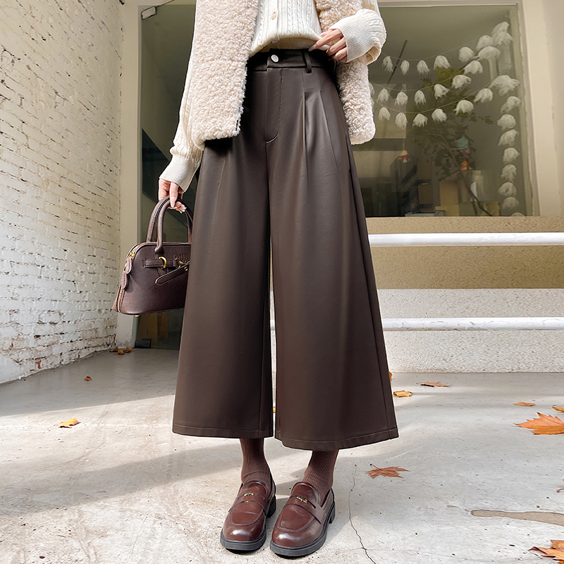 FA53988# 好质量咖色PU皮裤阔腿裤女秋冬小个子直筒弯刀七八分裤 服裝批發女裝批發服飾貨源
