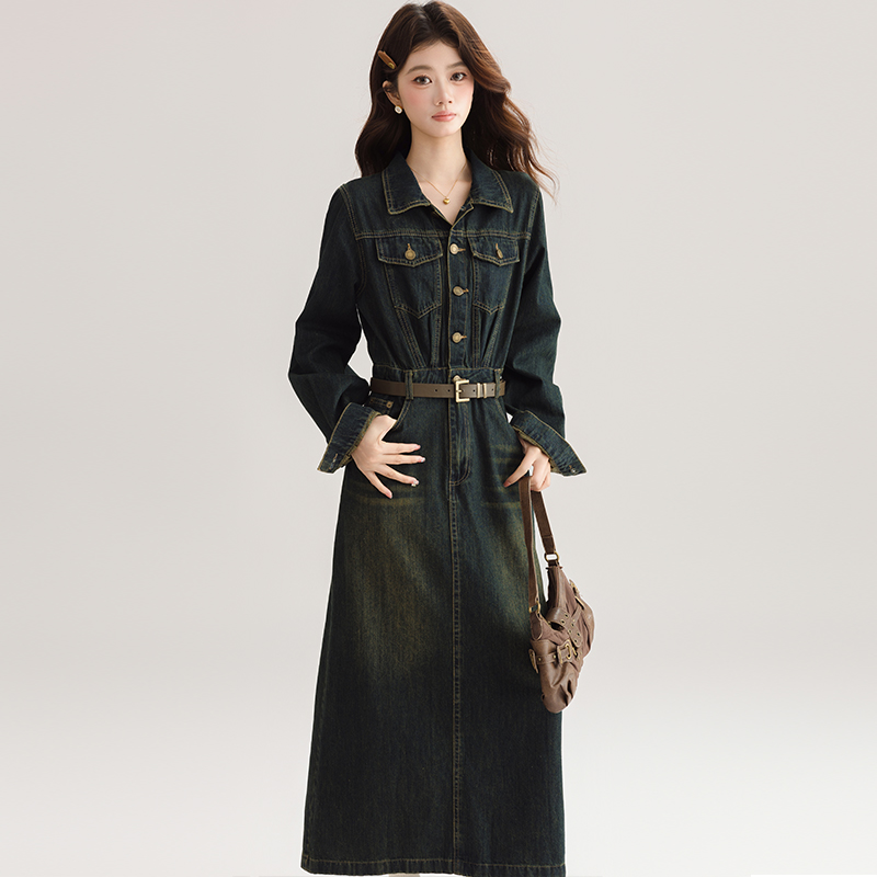 FA54001# 港风复古牛仔连衣裙女夏季新款高级感气质收腰显瘦开叉长裙 服裝批發女裝批發服飾貨源