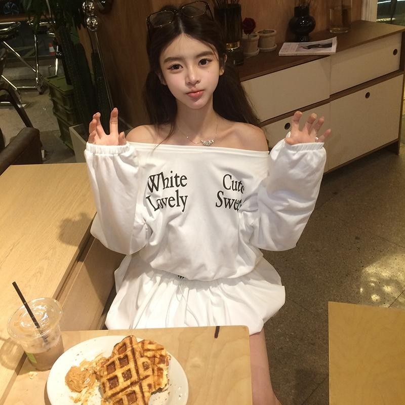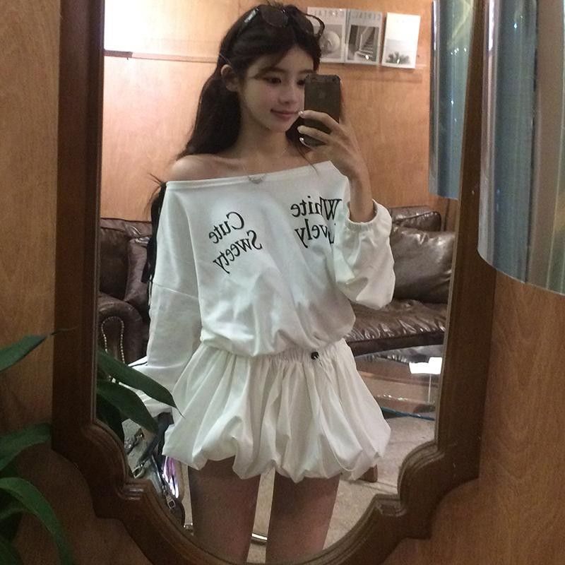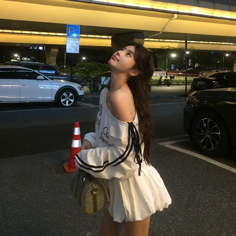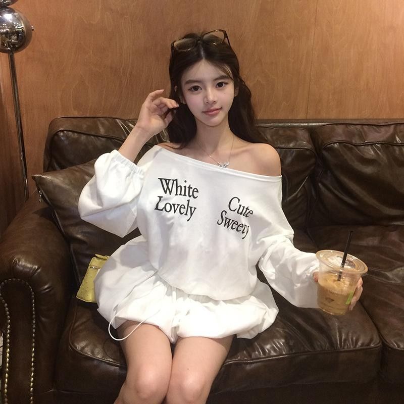 FA54031# 纯欲慵懒风撞色字母印花斜领露肩连衣裙女小众抽绳显瘦遮肉短裙 服裝批發女裝批發服飾貨源