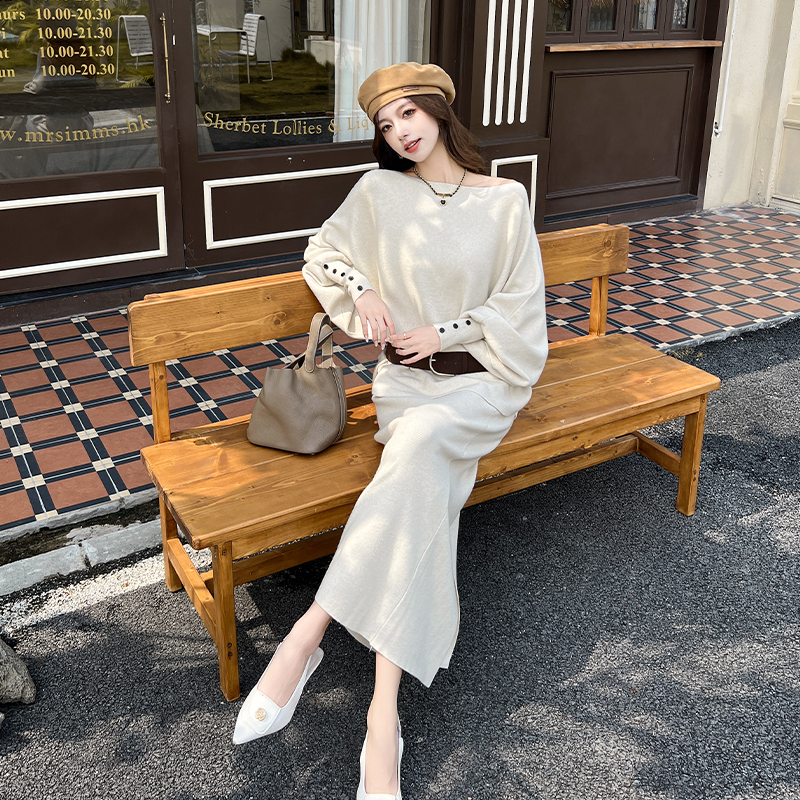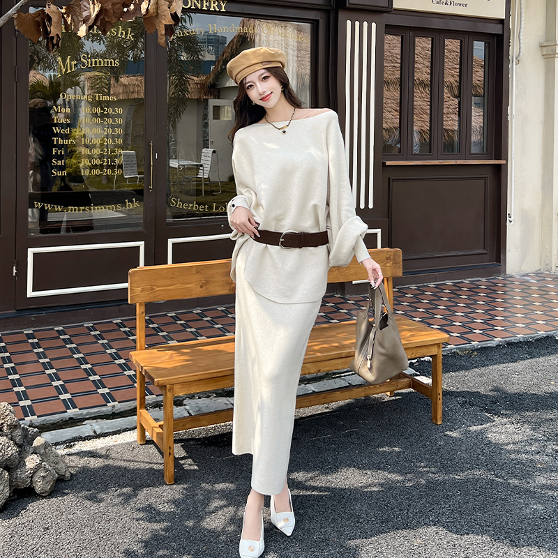 FA54187# 秋季法式气质慵懒风百搭显瘦毛衣+韩系高腰开叉半身裙套装女 服裝批發女裝批發服飾貨源