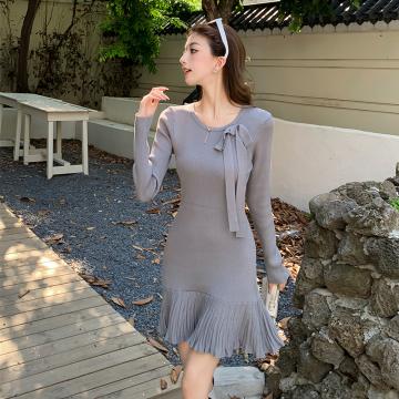 FA54194# 超好看连衣裙女冬款新款针织黑色气质内搭设计感百褶裙子 服裝批發女裝批發服飾貨源