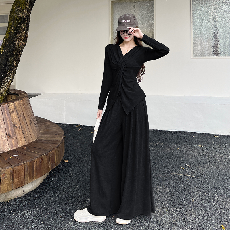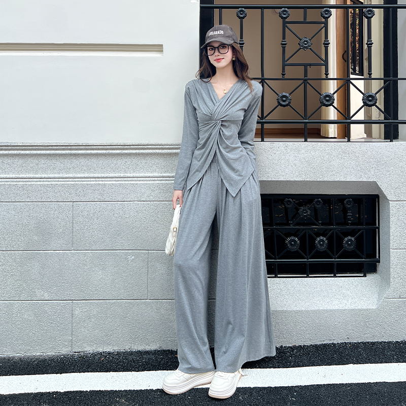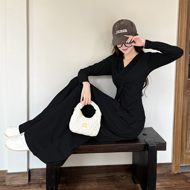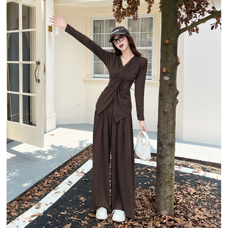 FA54196# 韩版时尚纽结修身V领长袖上衣女秋季高腰宽松拖地裤套装 服裝批發女裝批發服飾貨源