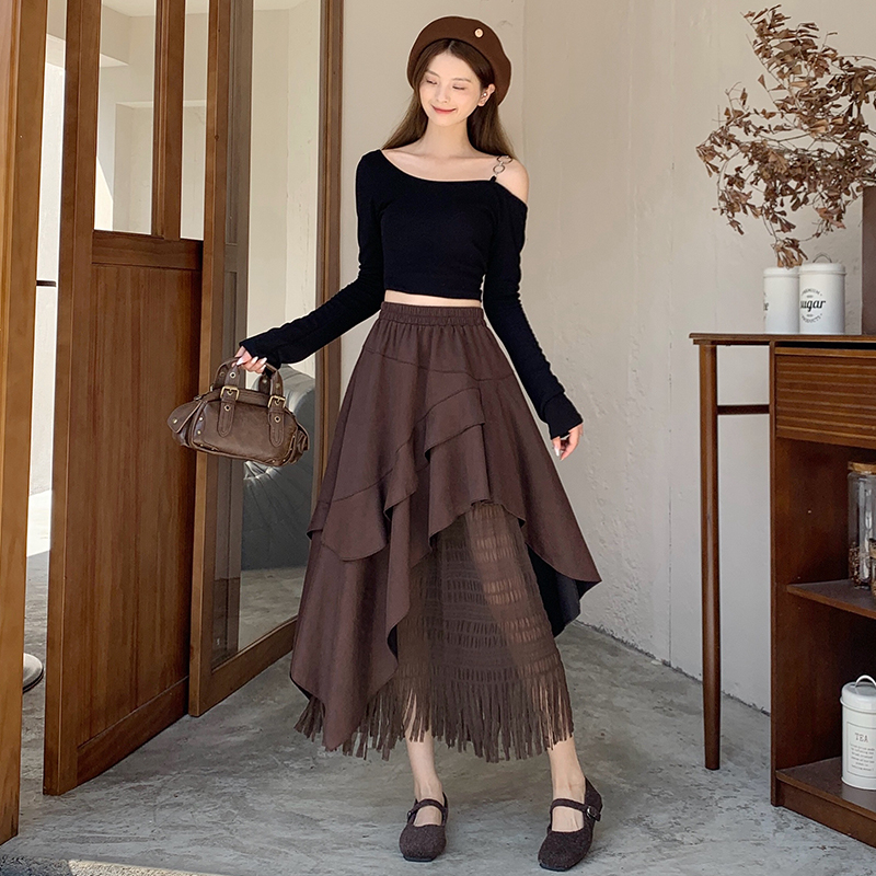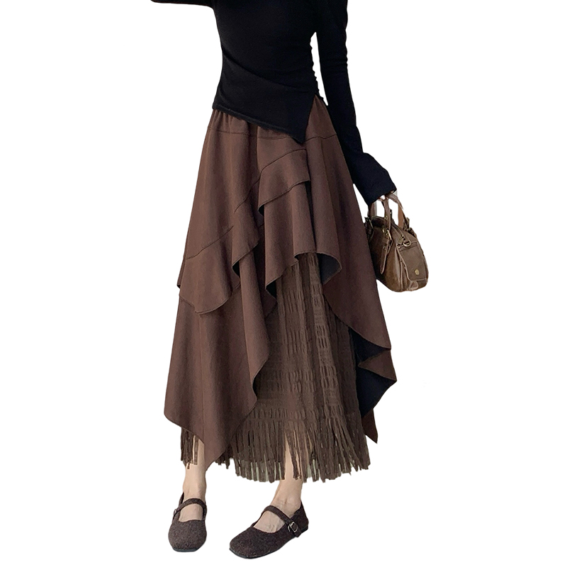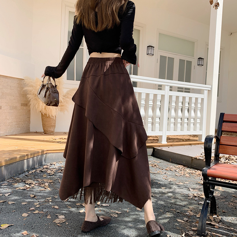 FA54201# 复古麂皮绒蕾丝拼接半身裙女秋冬不规则荷叶边高腰百搭A字蓬蓬裙 服裝批發女裝批發服飾貨源
