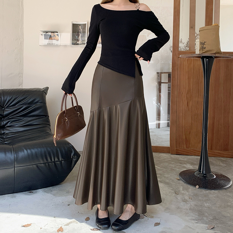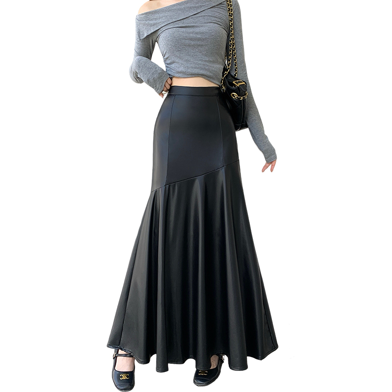 FA54208# 美式复古PU皮拼接半身裙秋冬新款A字高腰显瘦纯色长裙女 服裝批發女裝批發服飾貨源