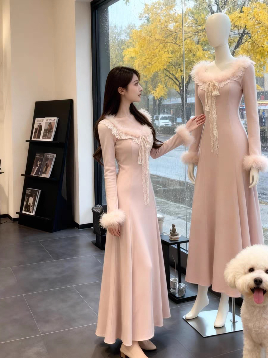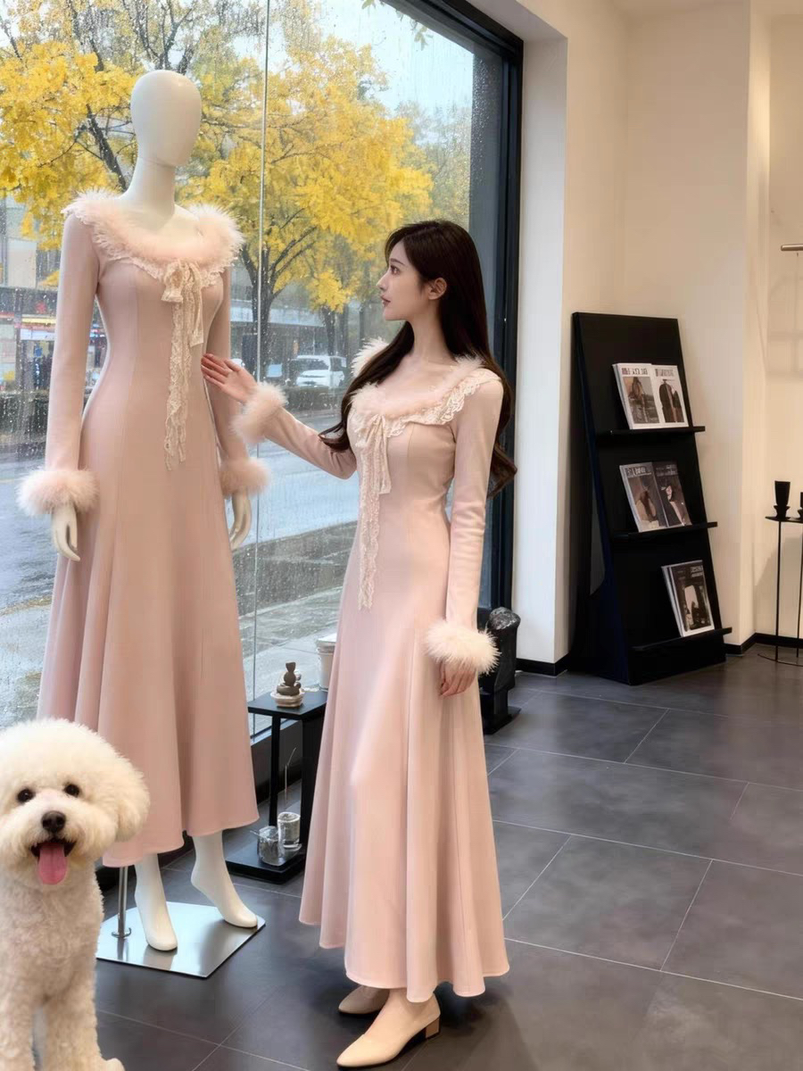 FA54218# 秋冬新款法式气质风收腰千金拼接毛毛蕾丝花边长袖连衣裙女潮 服裝批發女裝批發服飾貨源