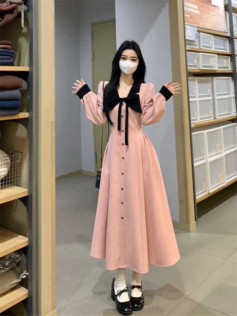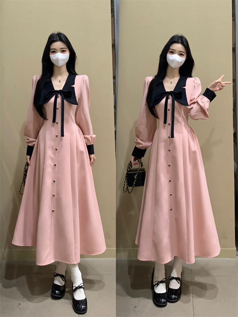 FA54221# 娃娃领法式气质小香风长袖连衣裙女秋冬高级感穿搭粉色衬衫裙 服裝批發女裝批發服飾貨源