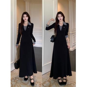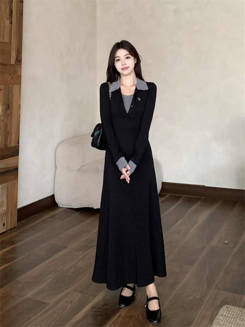 FA54222# 大码法式撞色翻领长袖连衣裙秋冬高级感收腰显瘦气质打底内搭长裙 服裝批發女裝批發服飾貨源