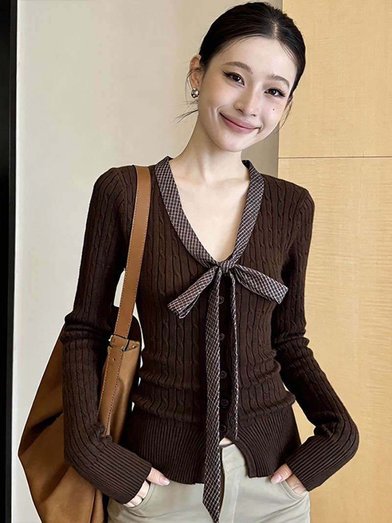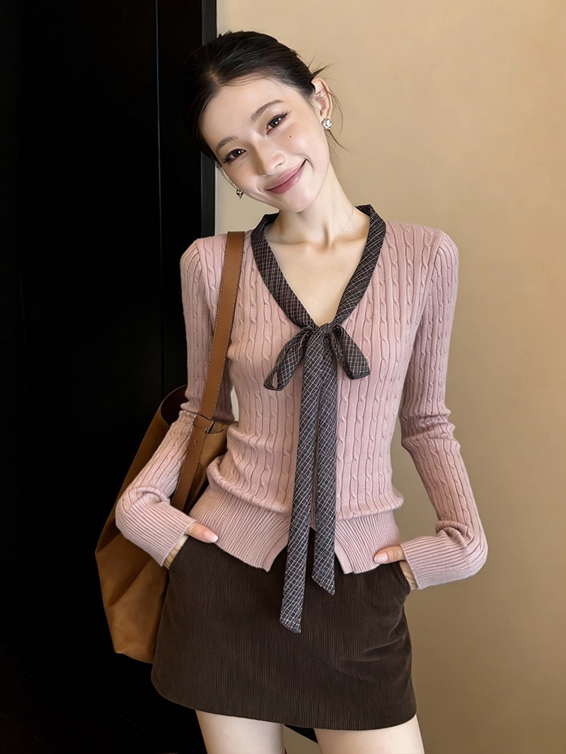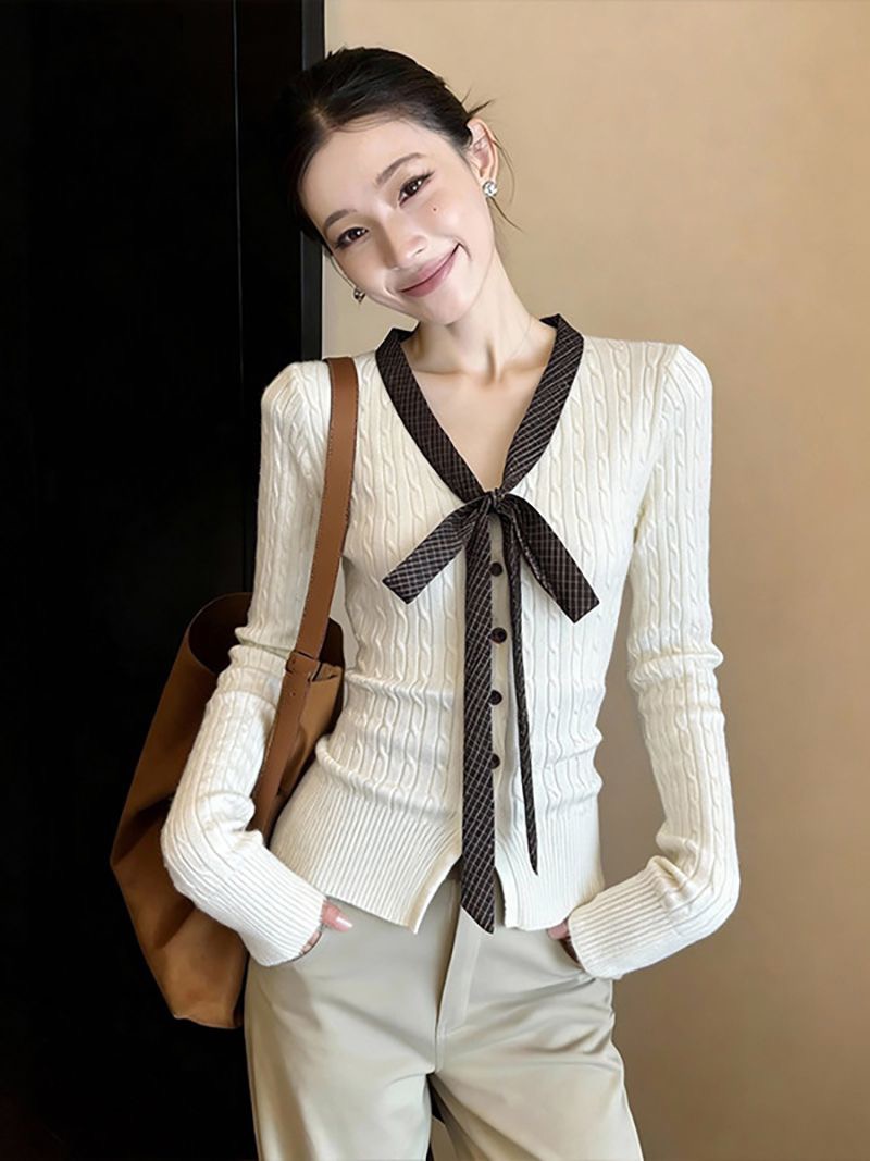 FA54605# 甜美V领蝴蝶结设计感针织开衫秋冬内搭修身上衣女 服裝批發女裝批發服飾貨源