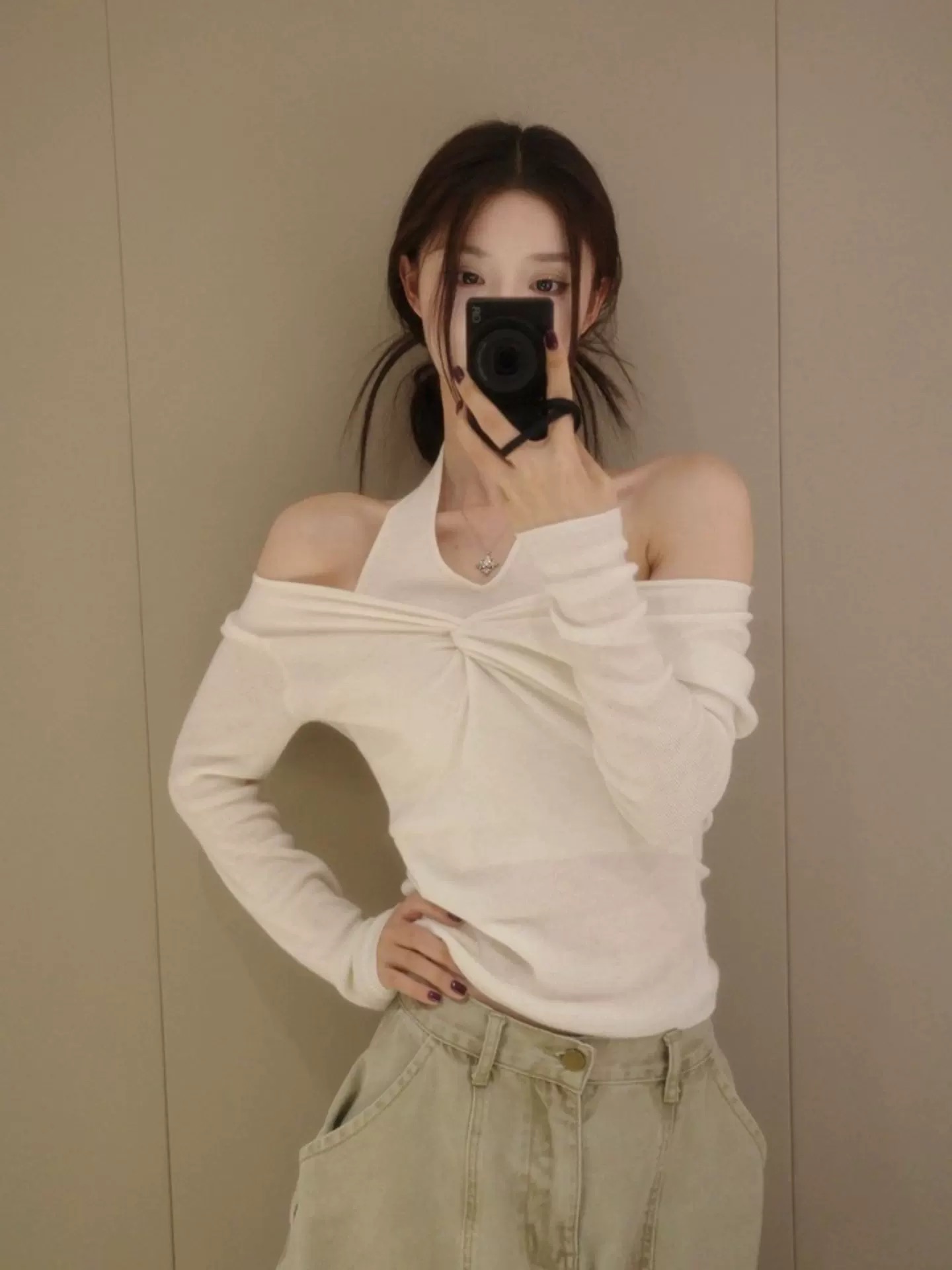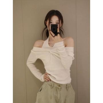 FA54611# 白色一字肩假两件挂脖长袖针织打底衫女秋冬内搭修身纯欲露肩上衣 服裝批發女裝批發服飾貨源