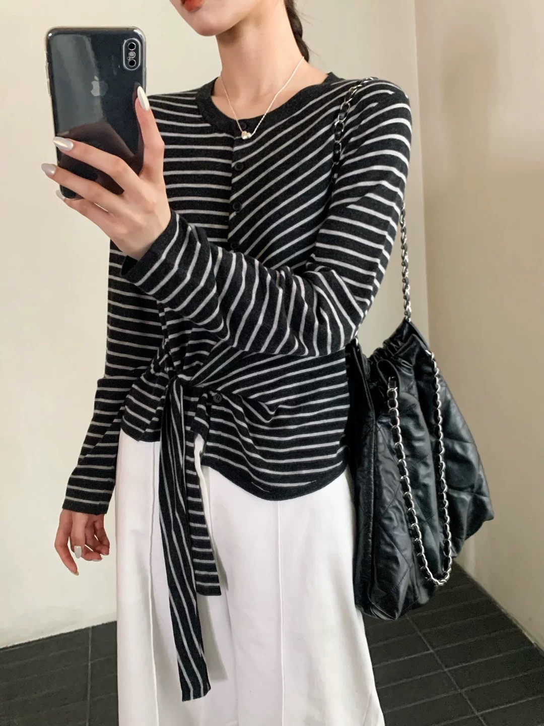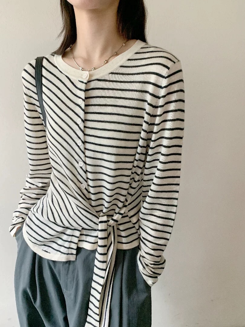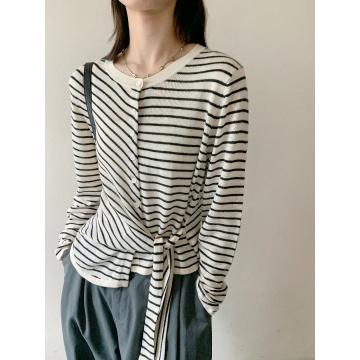 Home > 毛衣、针织衫 > FA54652# 秋季新款设计感撞色条纹系带长袖针织衫胖mm显瘦不规则T恤女 服裝批發女裝批發服飾貨源