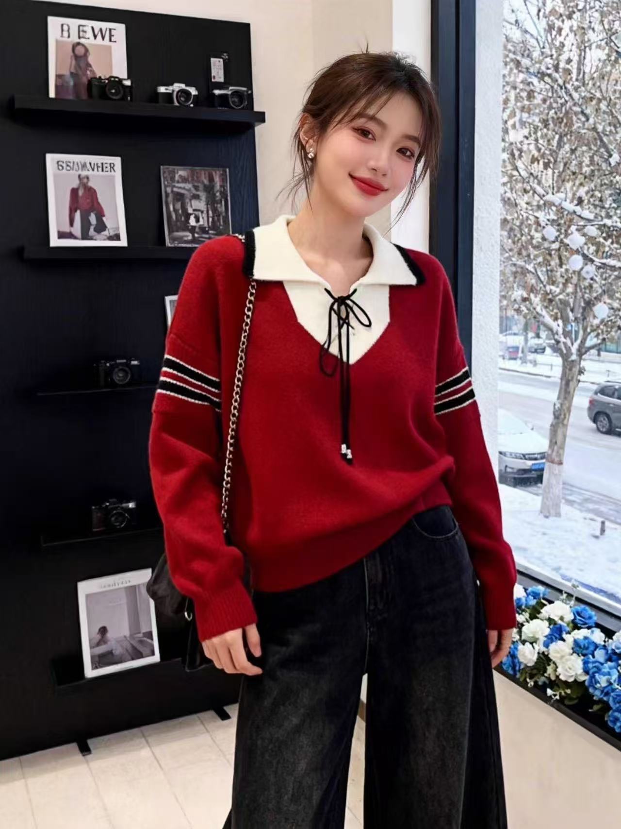 FA54668# 撞色拼接polo领毛衣女春季新款设计感小众内搭长袖 服裝批發女裝批發服飾貨源