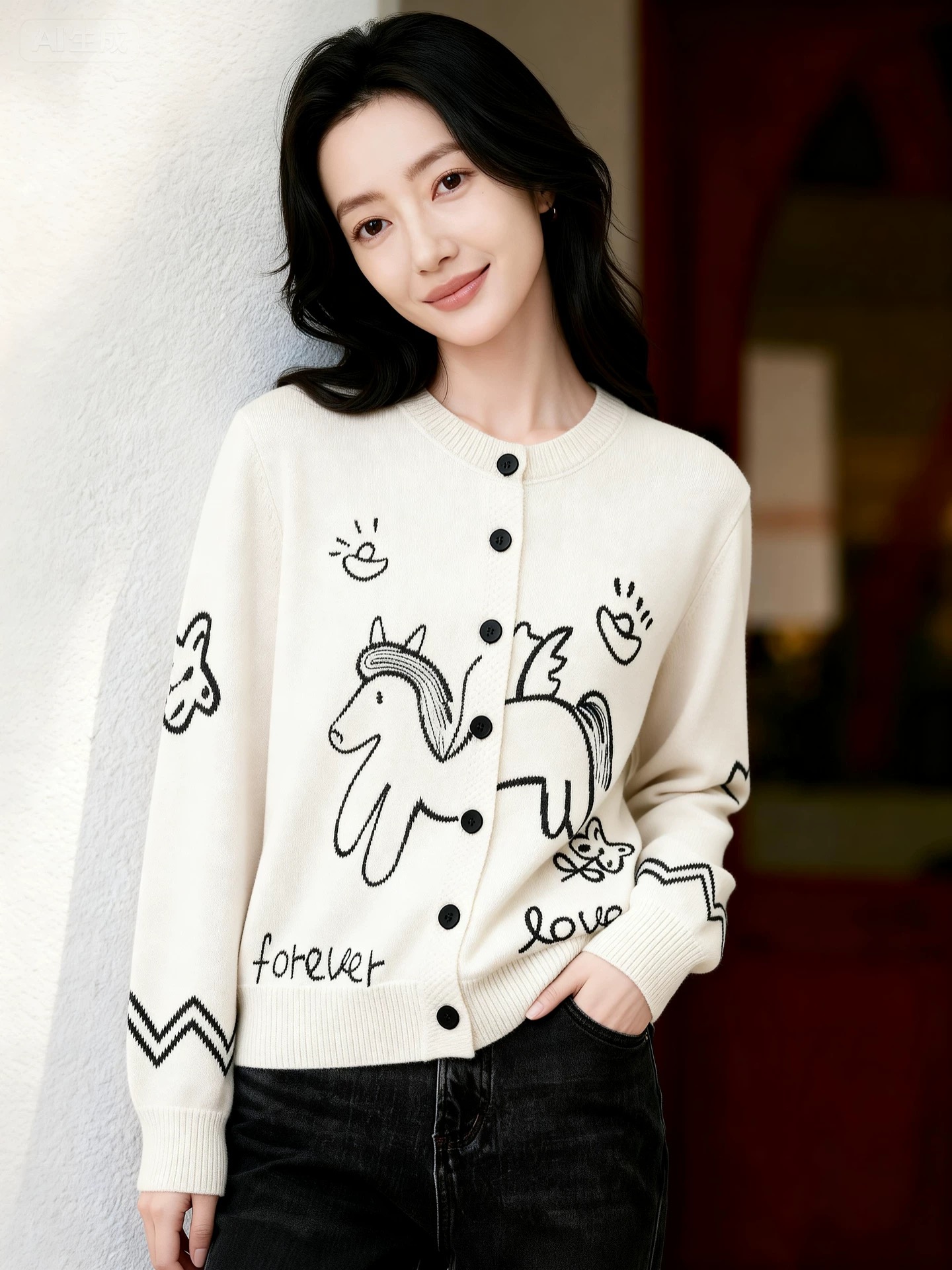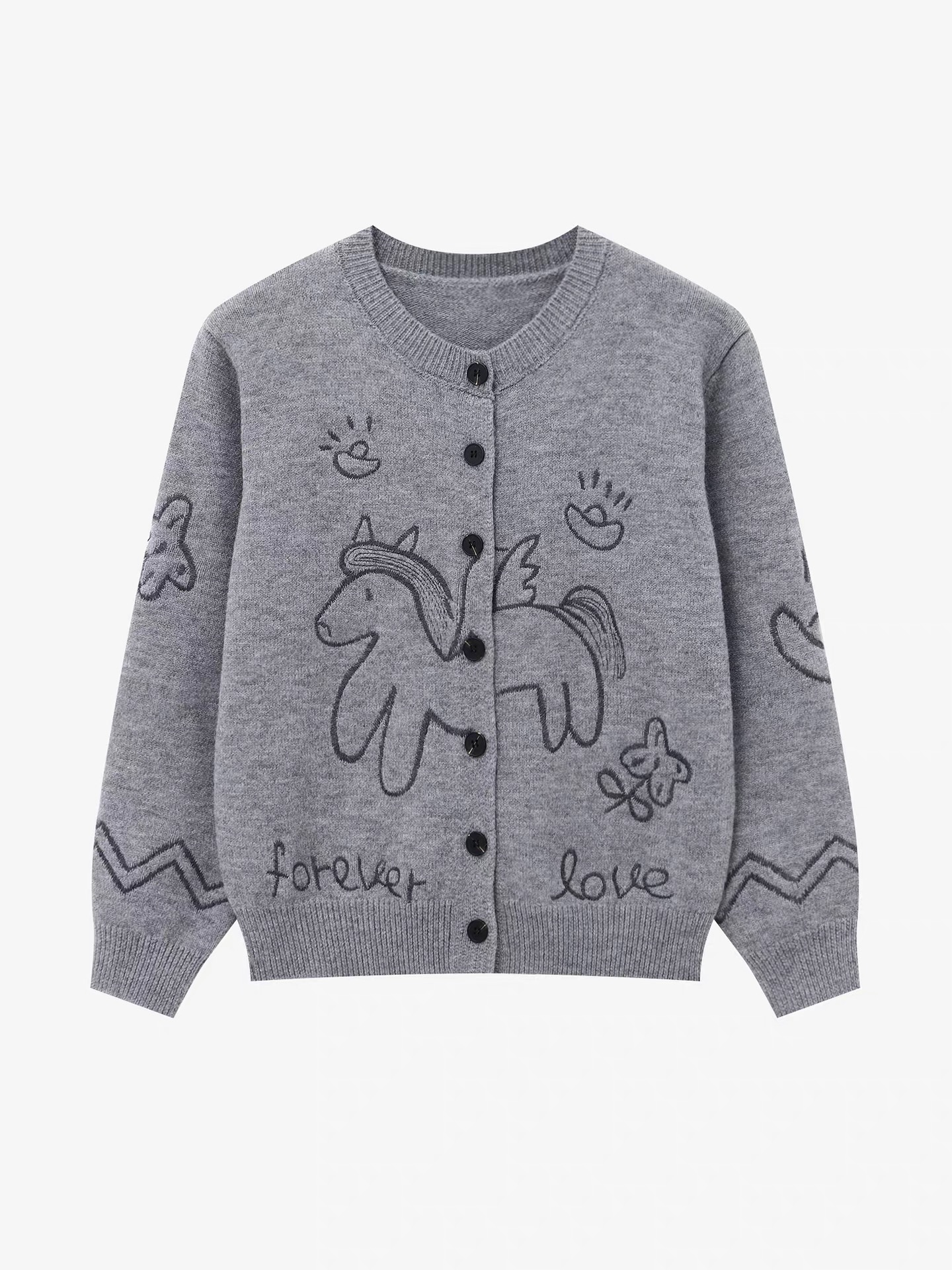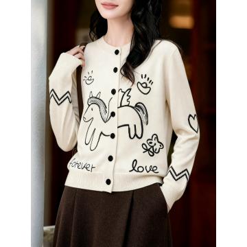 FA54686# 马上来财绵羊毛兔毛毛衣童趣提花刺绣宽松圆领针织开衫 服裝批發女裝批發服飾貨源