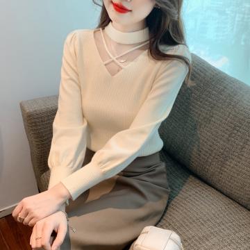 FA54708# 新款冬季韩版修身打底中领镂空针织灯笼袖打底上衣 服裝批發女裝批發服飾貨源