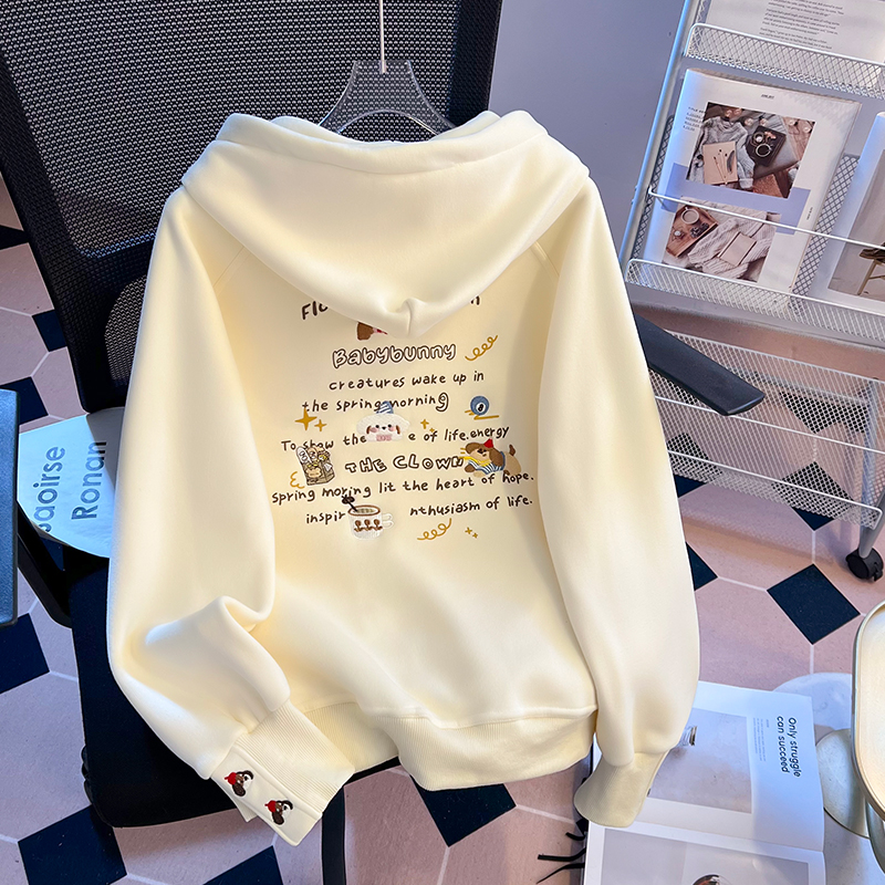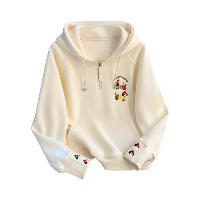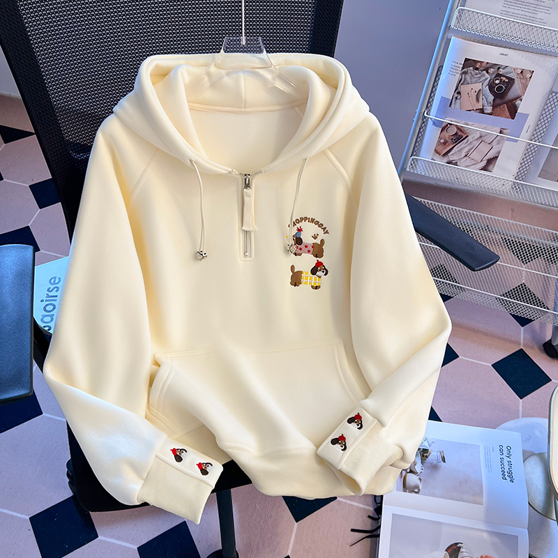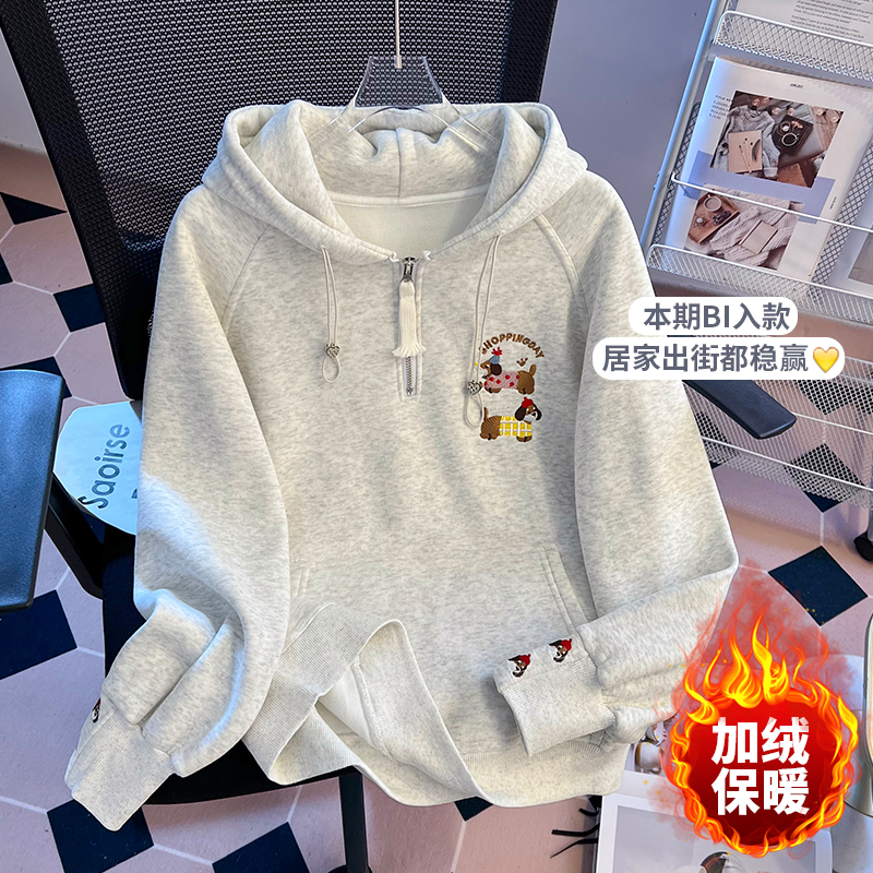 FA55144# 秋冬韩版慵懒风涂鸦公仔连帽重工刺绣半拉链抽绳时尚卫衣 服裝批發女裝批發服飾貨源