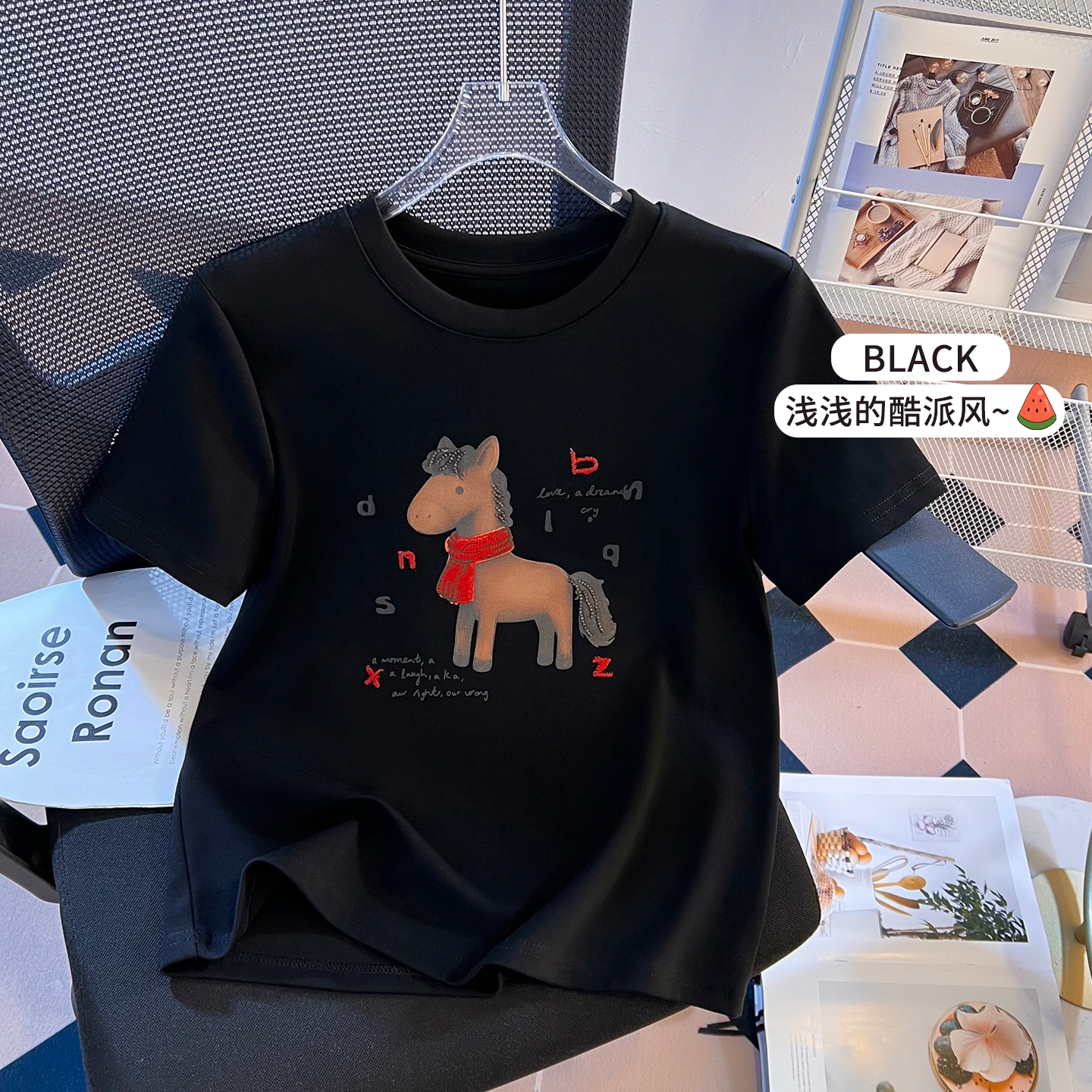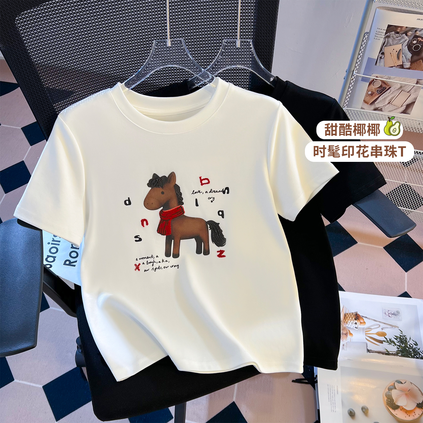 FA55146# 春季新款加厚纯棉重工刺绣订珠围巾小马印花短袖T恤女 服裝批發女裝批發服飾貨源